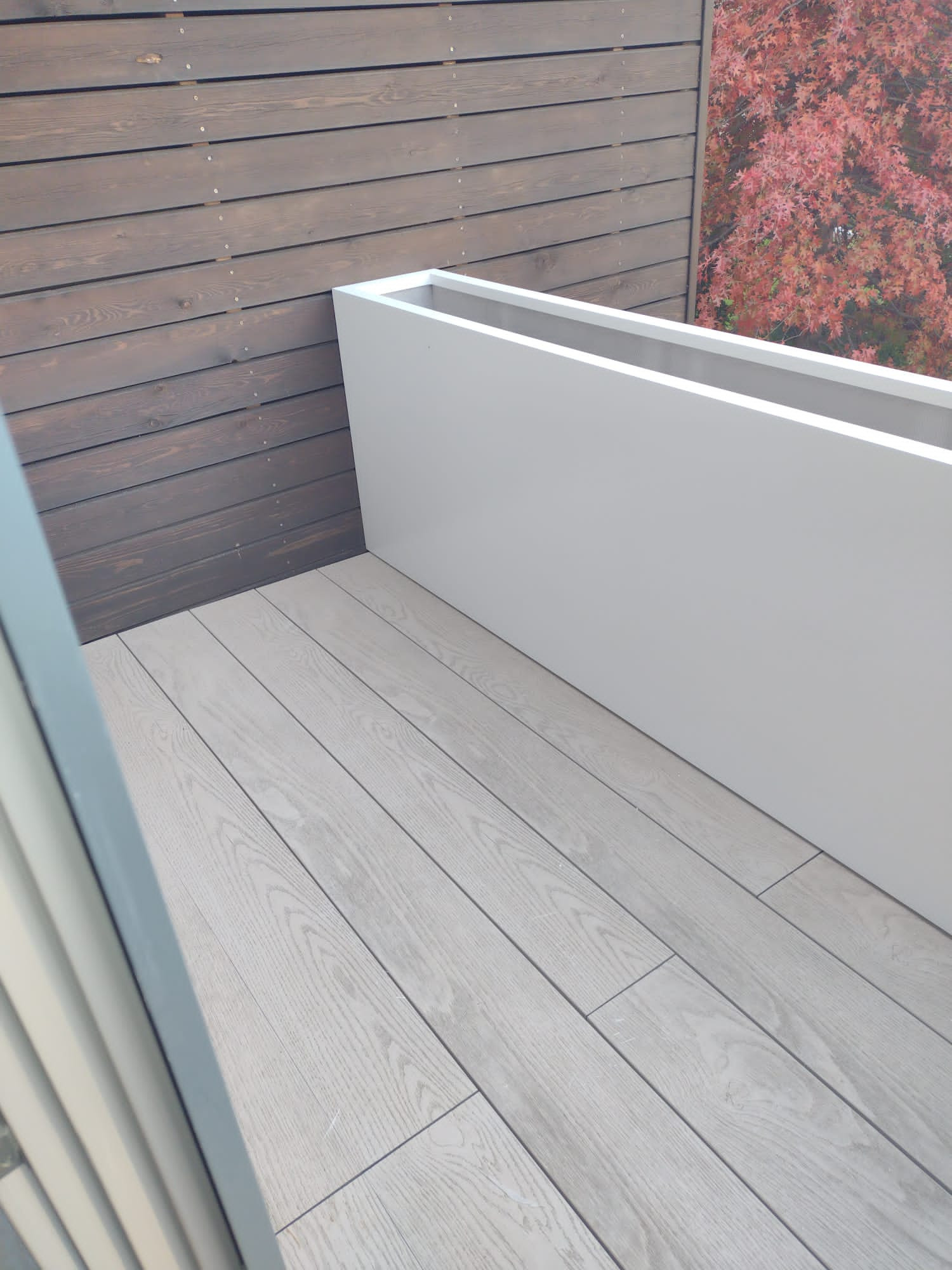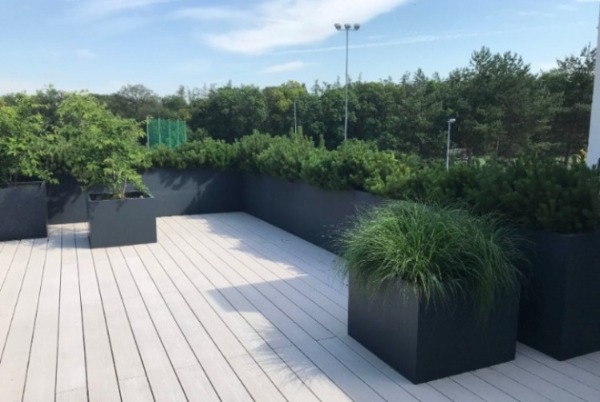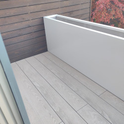 VARIANTA 7 / Dlouhý květináč, který je přirozeně zasazen do venkovní terasy a tvoří optické odclonění a zábradlí zároveň. Jeho rozměry umožňují výsadbu i větších rostlin a stromů