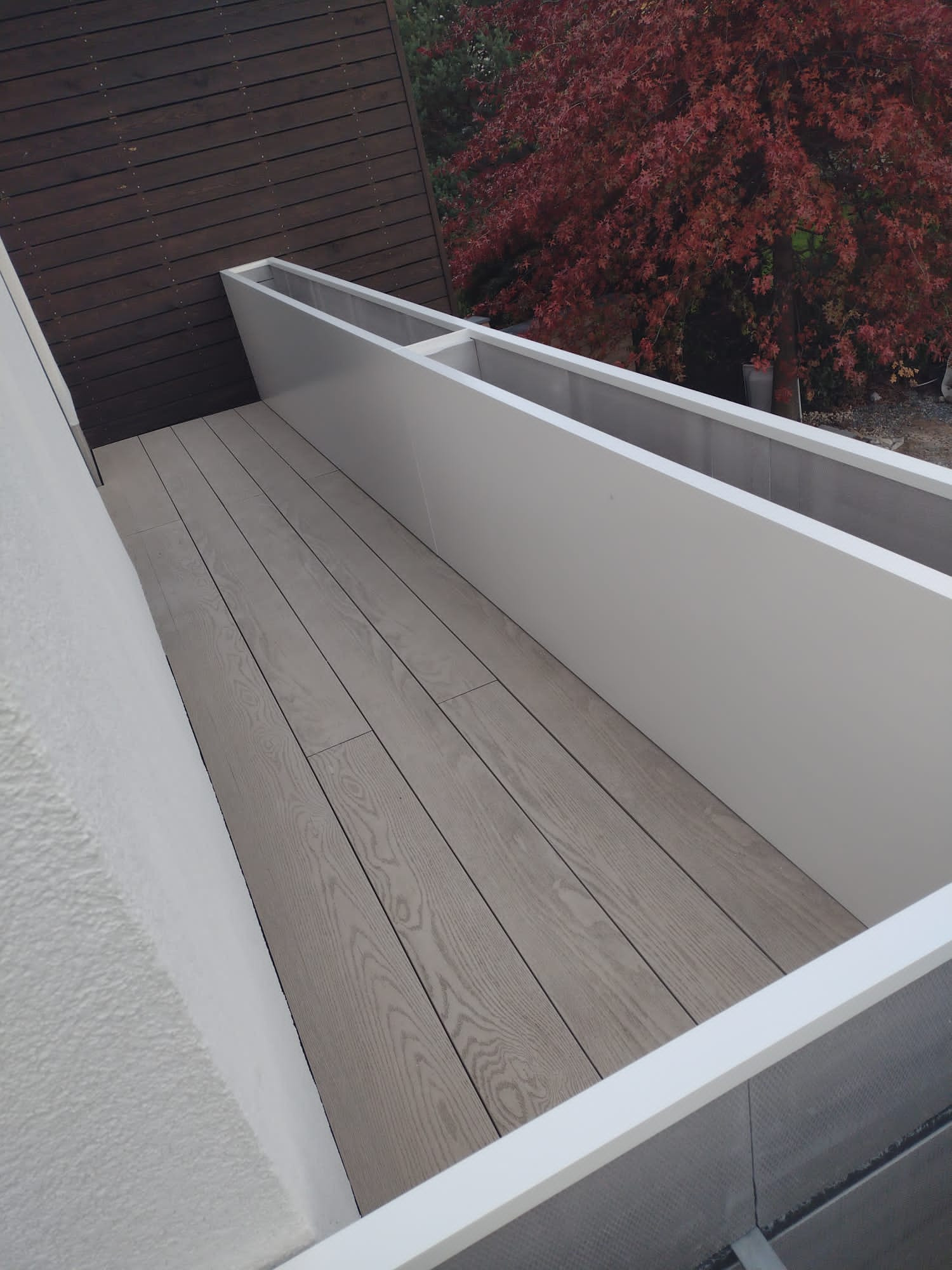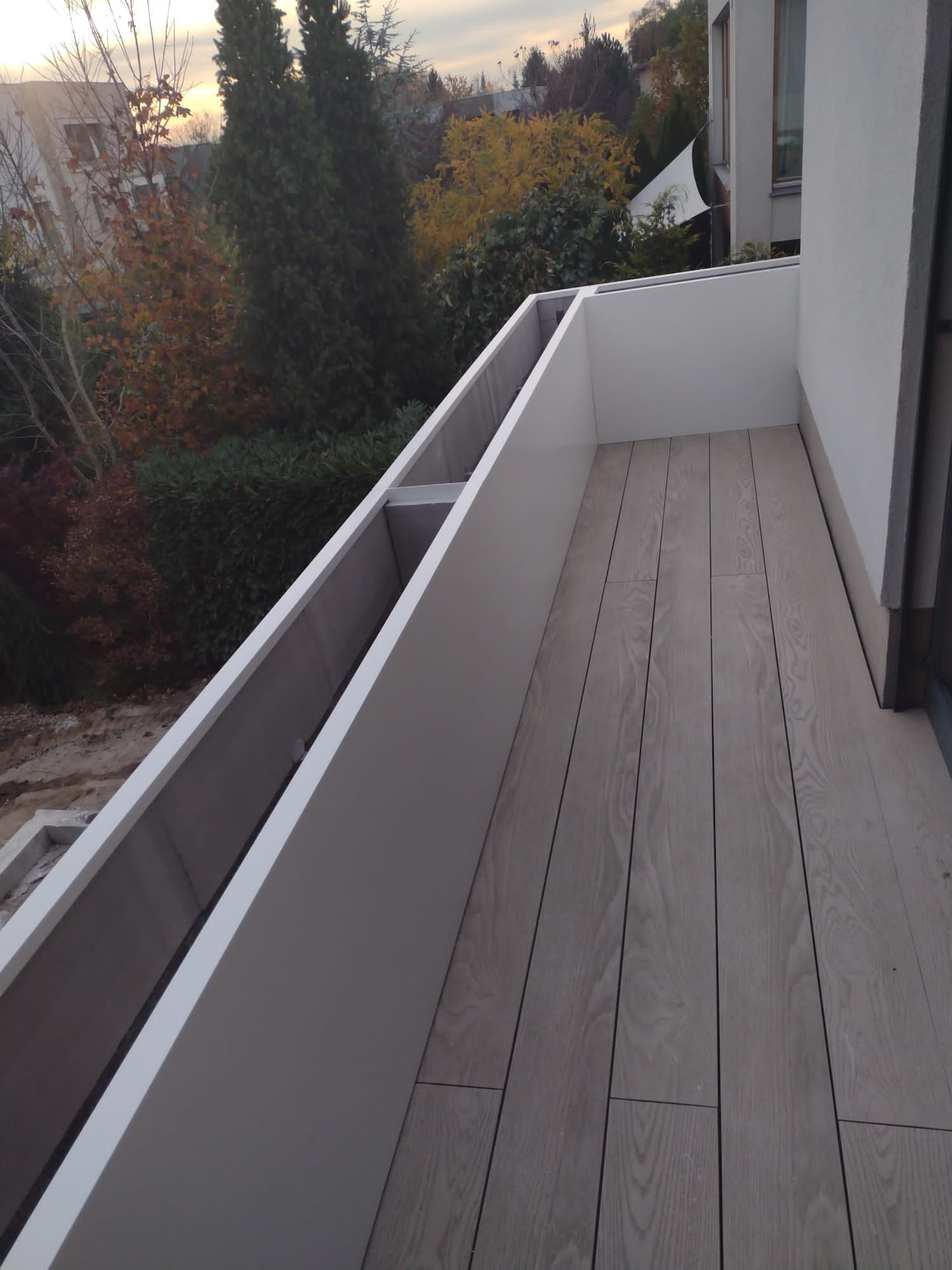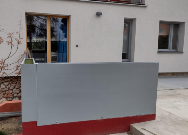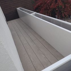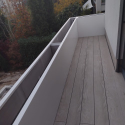 VARIANTA 1 / květináče tvoří zábradlí na jedné z teras rodinného domu. Květináče jsou sesazeny do tvaru L a jednotlivé krátké stěny jsou k době sesazeny a sešroubovány. S ohledem na širokou základnu truhlíků nebylo potřeba květináče kotvit do podlahy.