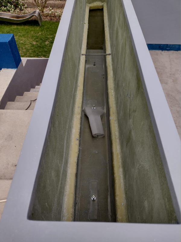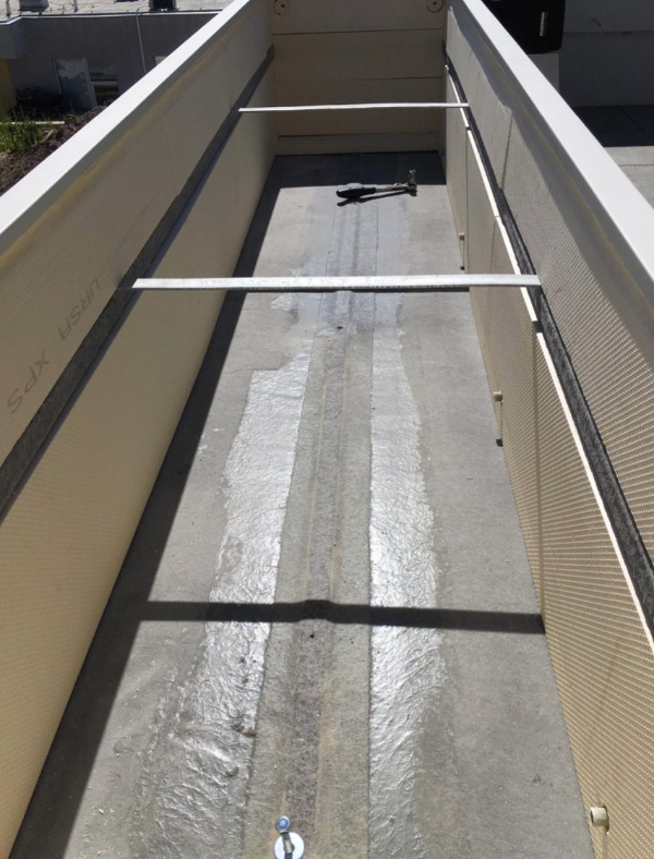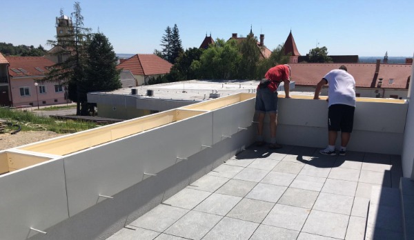 VARIANTA 4 / situace, kdy květináče tvoří zábradlí na nižší betonové podezdívce. Květináče jsou kotveny přímo k podlaze chemickou kotvou. Odtokové trubice jsou umístěny do boku květináče a betonová zídka je dokonale chráněna před případnou vlhkostí.