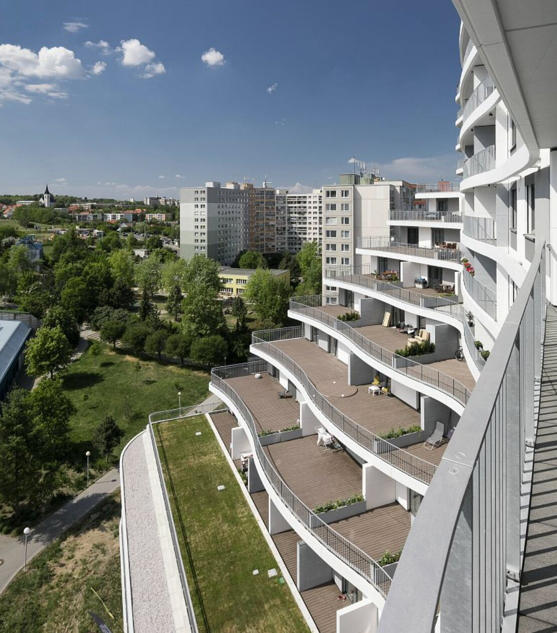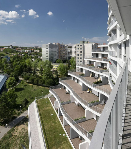 Tento bytový dům počítal již ve fázi projektu s umístěním květináčů tak, že plní funkci dělícího prvku mezi jednotlivými terasami bytů. Toto jednoduché řešení je i u takto ohromného investičního záměru velice účinné. Dotváří barevnou i tvarovou koncepci celého objektu a zároveň netradičně řeší oddělení a odclonění jednotlivých teras bytů. Venkovní terasy tak tvoří jednotný celek a zbývá jen počkat, až rostliny v nádobách povyrostou a nabídnou obyvatelům domu soukromí a zároveň zeleň a vzdušné prostředí. Do truhlíků jsme použili integrovaný zavlažovací systém. Samozavlažovací květináče zajišťují optimální závlahu pro růst zasazených keřů.