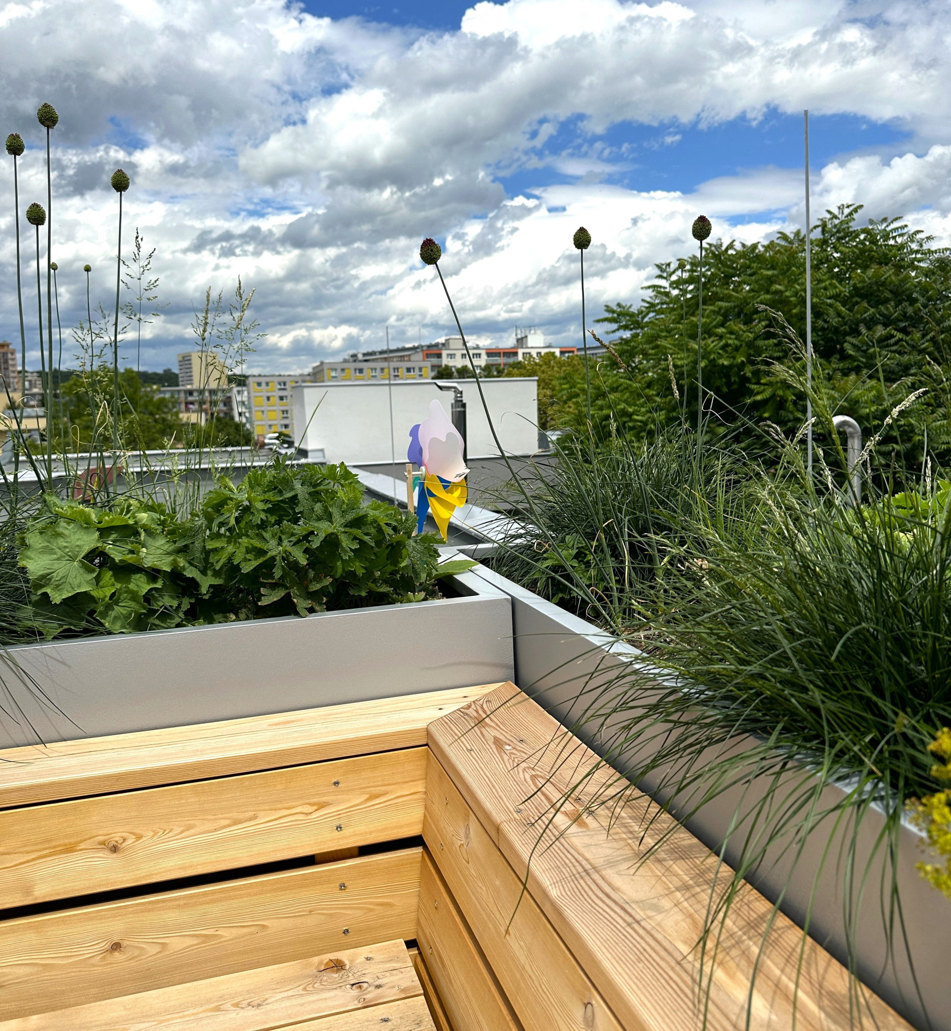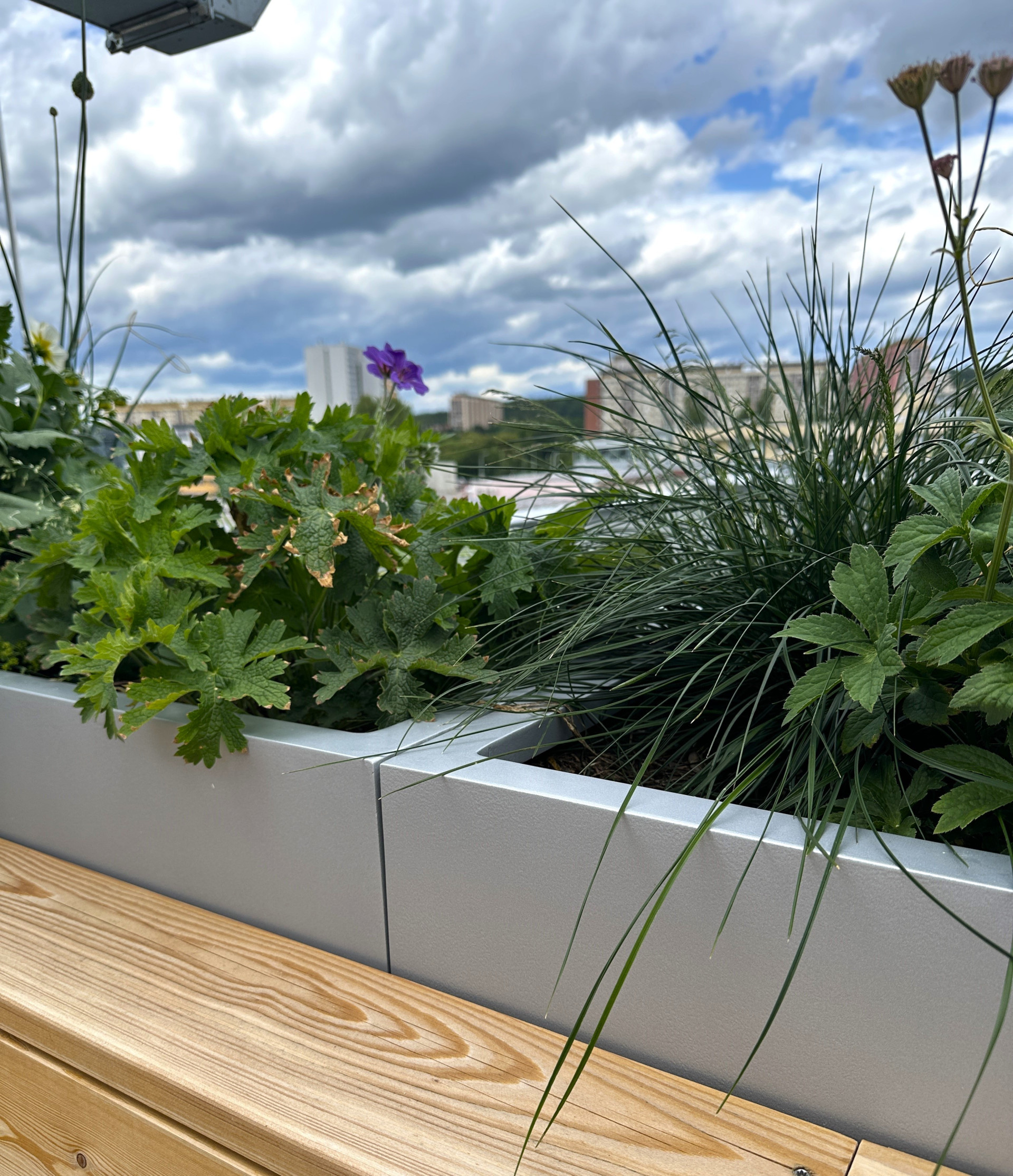 Velké květináče se staly součástí moderní terasy, která slouží jako oáza klidu pro zaměstnance, kde mohou relaxovat a načerpat energii.