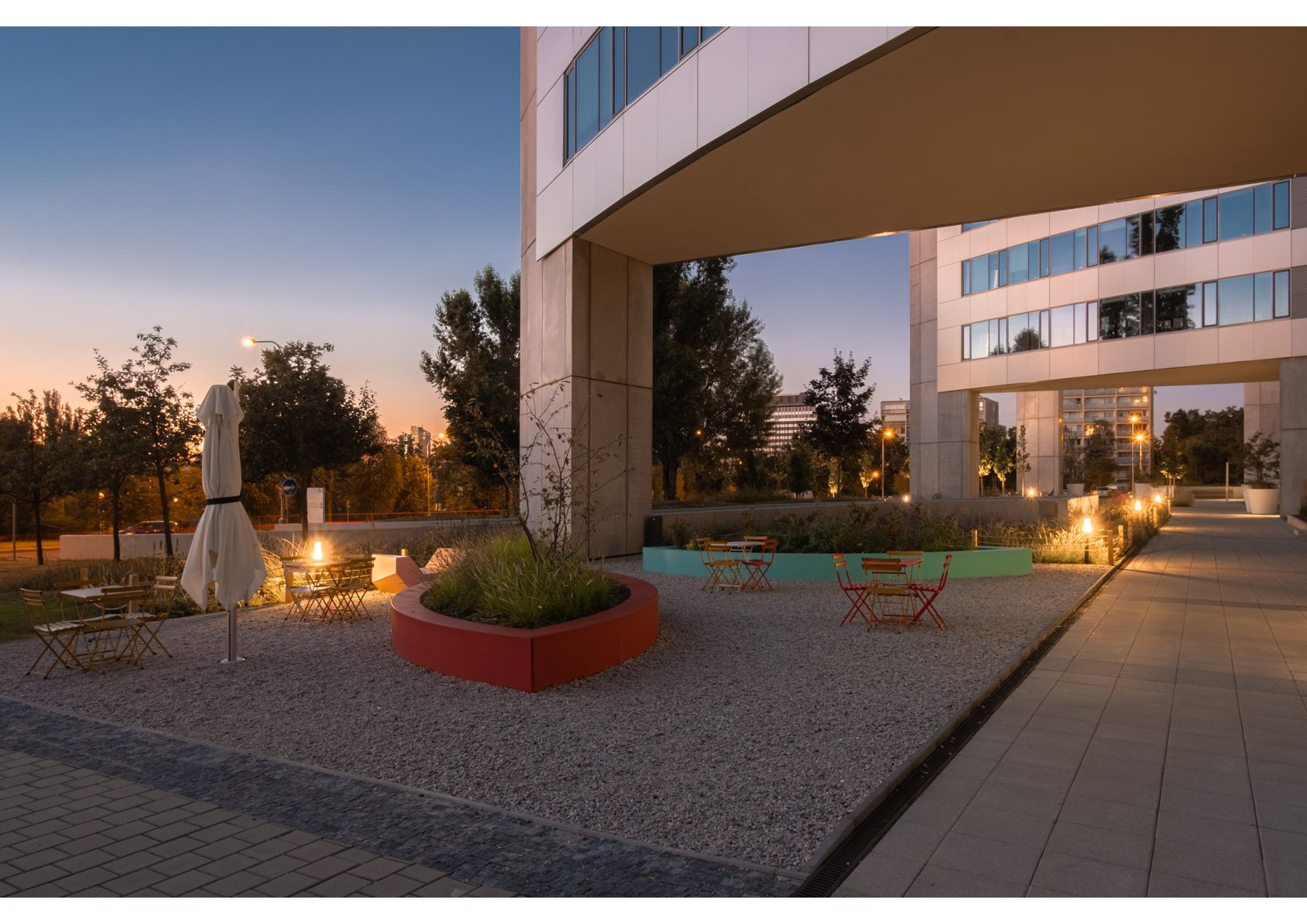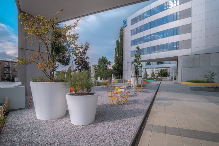 V rámci veřejného prostoru KAVČÍ HORY OFFICE PARK, jsme měli možnost spolupracovat se známou brněnskou kanceláří PARTERO. Jejich návrh vycházel z klasických forem kónického květináče, ale v rozměrech, které jsou svou velikostí naprosto jedinečné. Instalaci obřích kónických květináčů jsme doplnili truhlíky se čtvercovým půdorysem, ale opět v nadstandardní velikosti. A jako protipól ke klasickým formám a tvarům květináčů byly použity atypické tvary, které jsme pracovně nazvali lodě. U zakázek, které jsou veřejně přístupné není příliš obvyklé pracovat s barevným konceptem, který nezapadá do klasických barev bílá, šedá nebo antracit. Proto je výrazným osvěžením celého projektu volba barevných tónů.