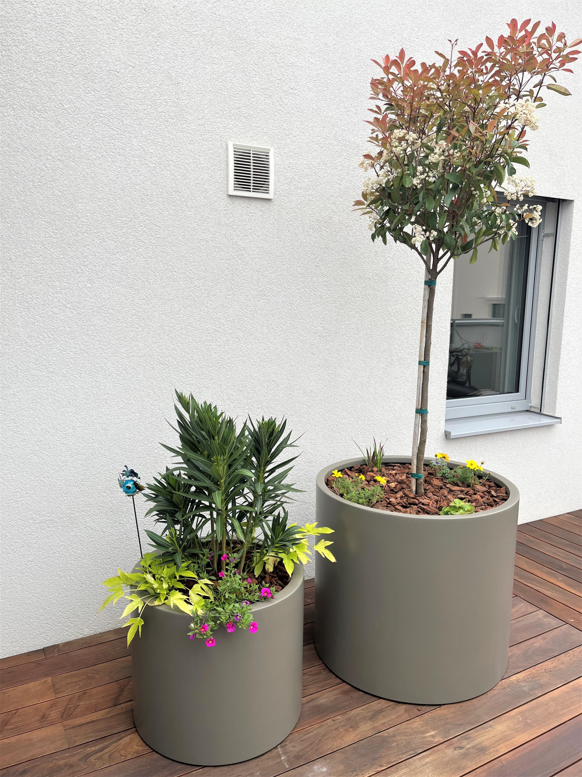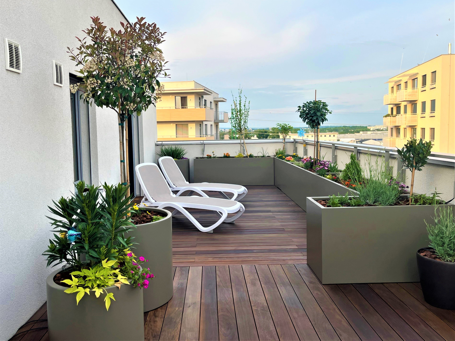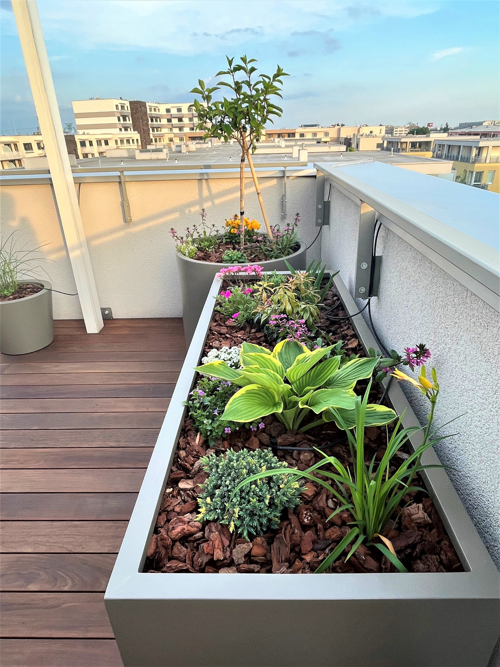 Květináče na míru v odstínu RAL 7006 se lehce kombinují se dřevem a rozmanitým pozadím. Květináče na terasu ve tvaru kvádrů dosahují délky přes 2 metry a plynule na sebe navazují po celém obvodu terasy. Vzrostlá výsadba vytvoří do budoucna přírodní zábradlí a soukromí v bytové zástavbě. Venkovní terasu doplňují další tvary květináčů válec a kónický válec. Jedná se o modolové řady CILYNDER A CALIPPO. Odměnou této kombinace venkovních květináčů, je výhled do zeleně a na barevně kvetoucí rostliny. Celý koncept navržené terasy s květináči POTS s. r. o. působí harmonicky a především prakticky.