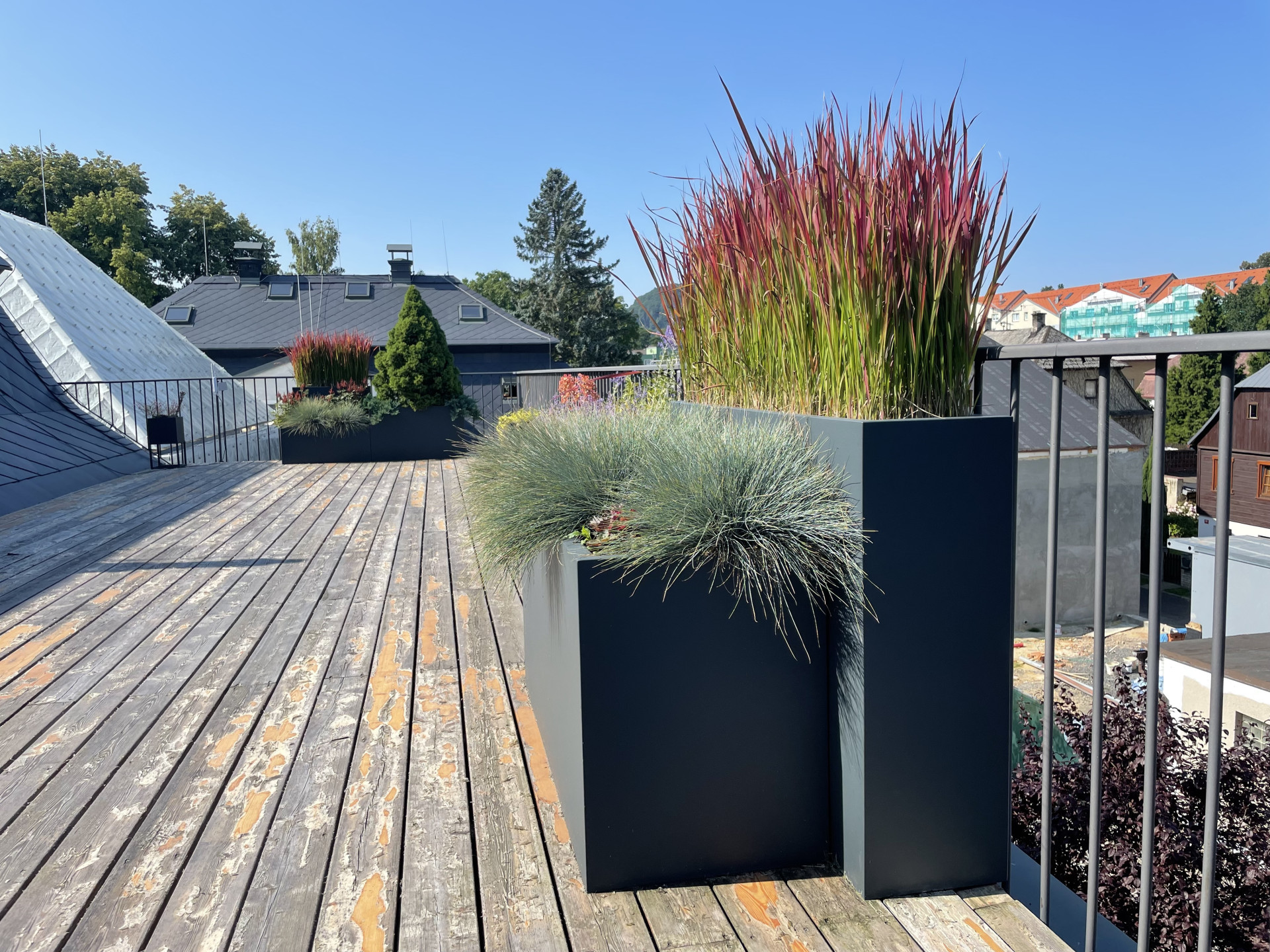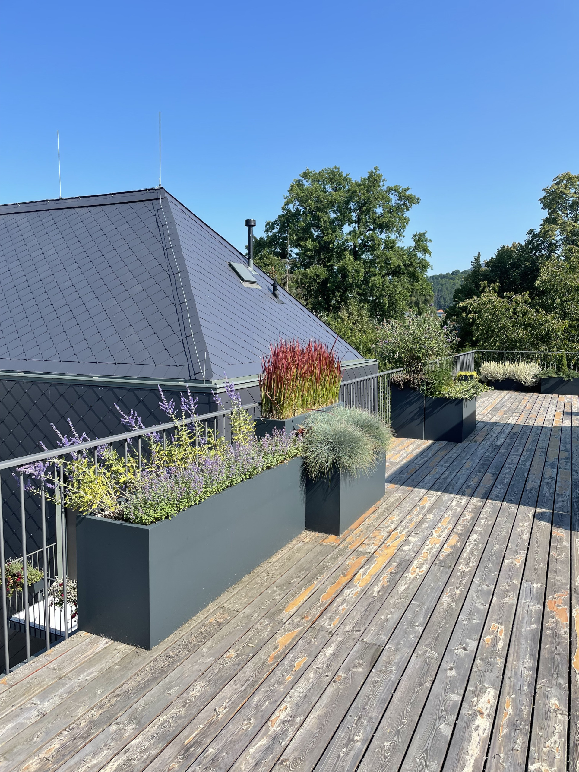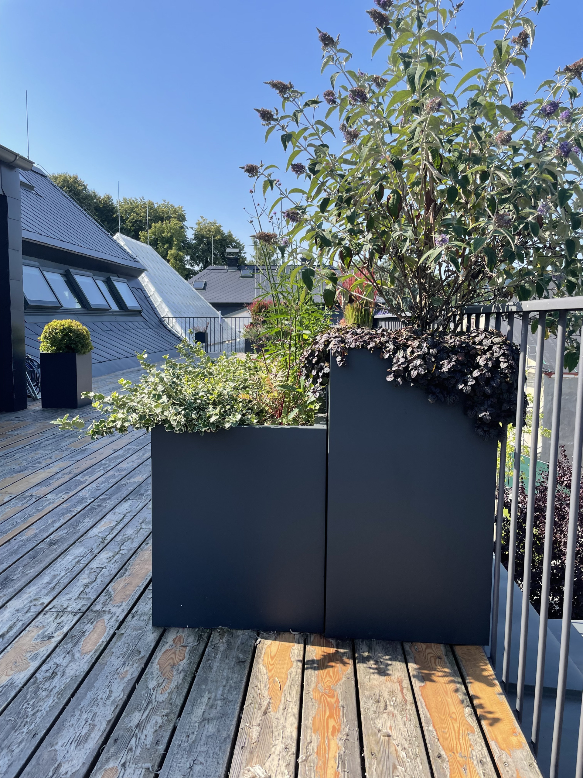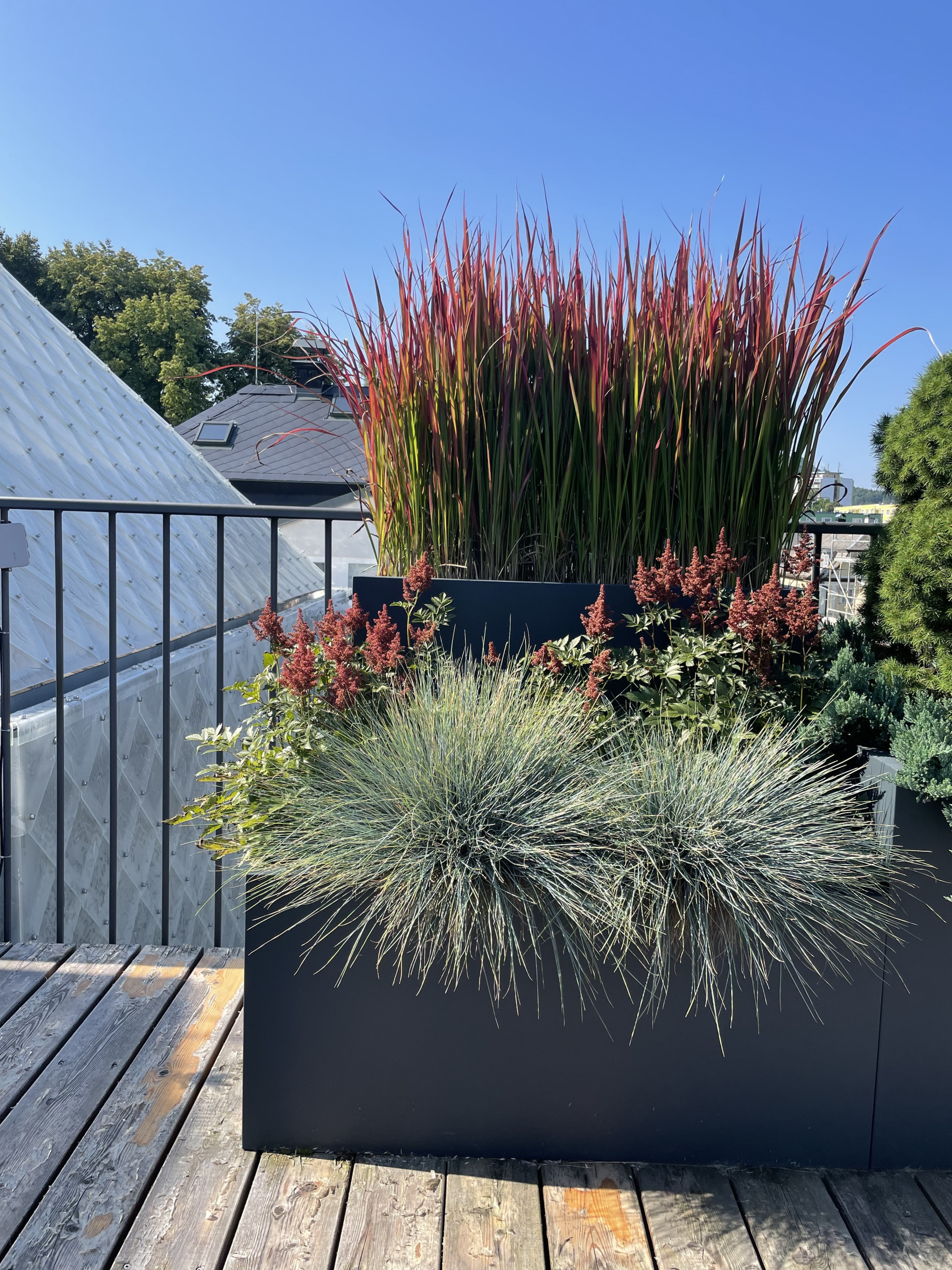Tvarově jsme se ve venkovní části pohybovali v čistých kvadratických formách. Celkový dojem z květináčů je velice nenápadný a umírněný. O to více vyniká výsadba, kterou tvoří mix barevných trav a jehličnanů. Také umístění květináčů za sebe, místo vedle sebe tvoří zajímavý efekt. Různě vysoké rostliny tak tvoří kaskády a opticky působí bohatším a kompaktnějším dojmem. Počet nádob je zvolen citlivě a celkově působí terasa díky květináčům vzdušně a uvolněně.