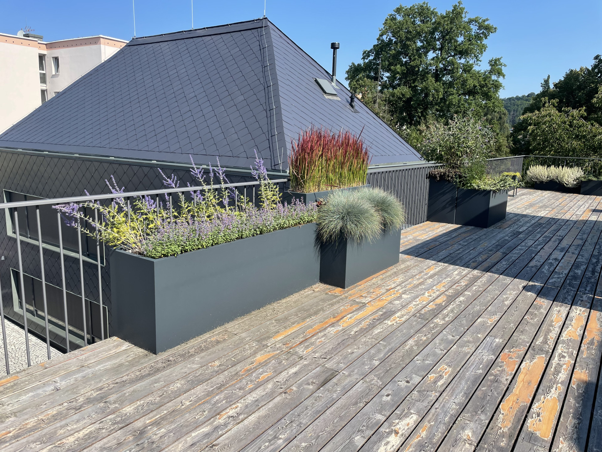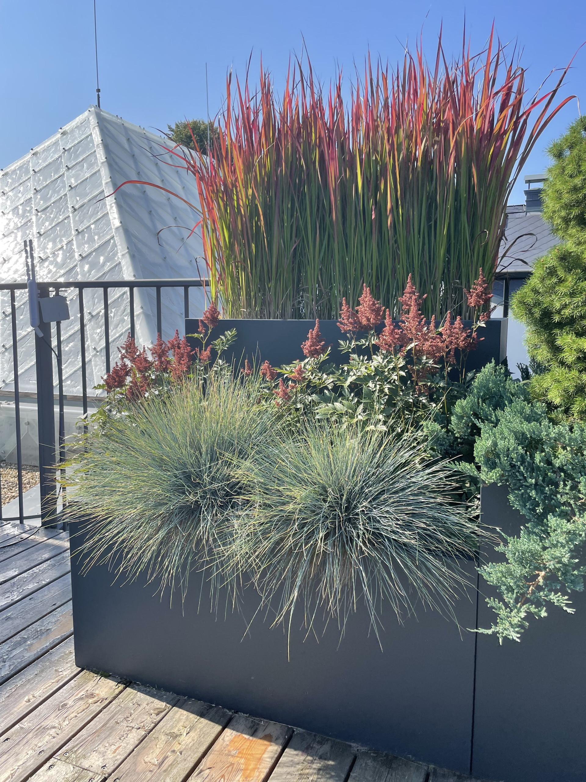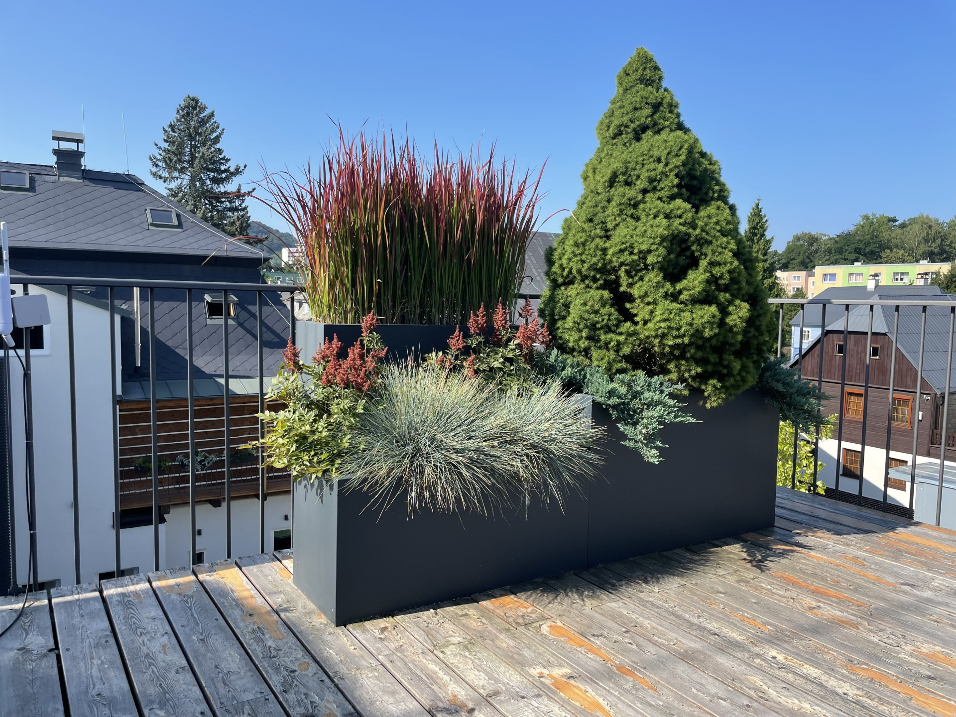 Tvarově jsme se ve venkovní části pohybovali v čistých kvadratických formách. Celkový dojem z květináčů je velice nenápadný a umírněný. O to více vyniká výsadba, kterou tvoří mix barevných trav a jehličnanů. Také umístění květináčů za sebe, místo vedle sebe tvoří zajímavý efekt. Různě vysoké rostliny tak tvoří kaskády a opticky působí bohatším a kompaktnějším dojmem. Počet nádob je zvolen citlivě a celkově působí terasa díky květináčům vzdušně a uvolněně.