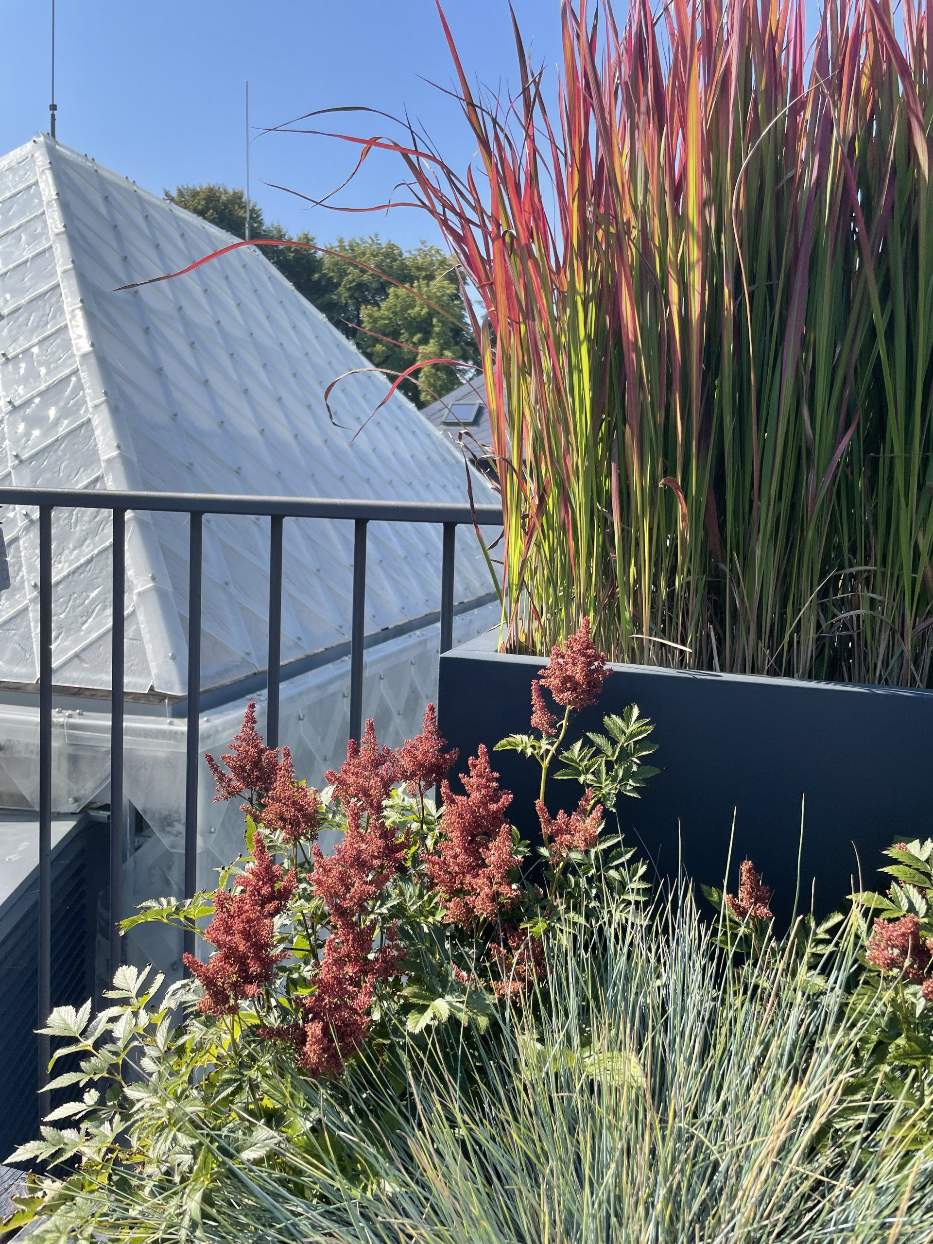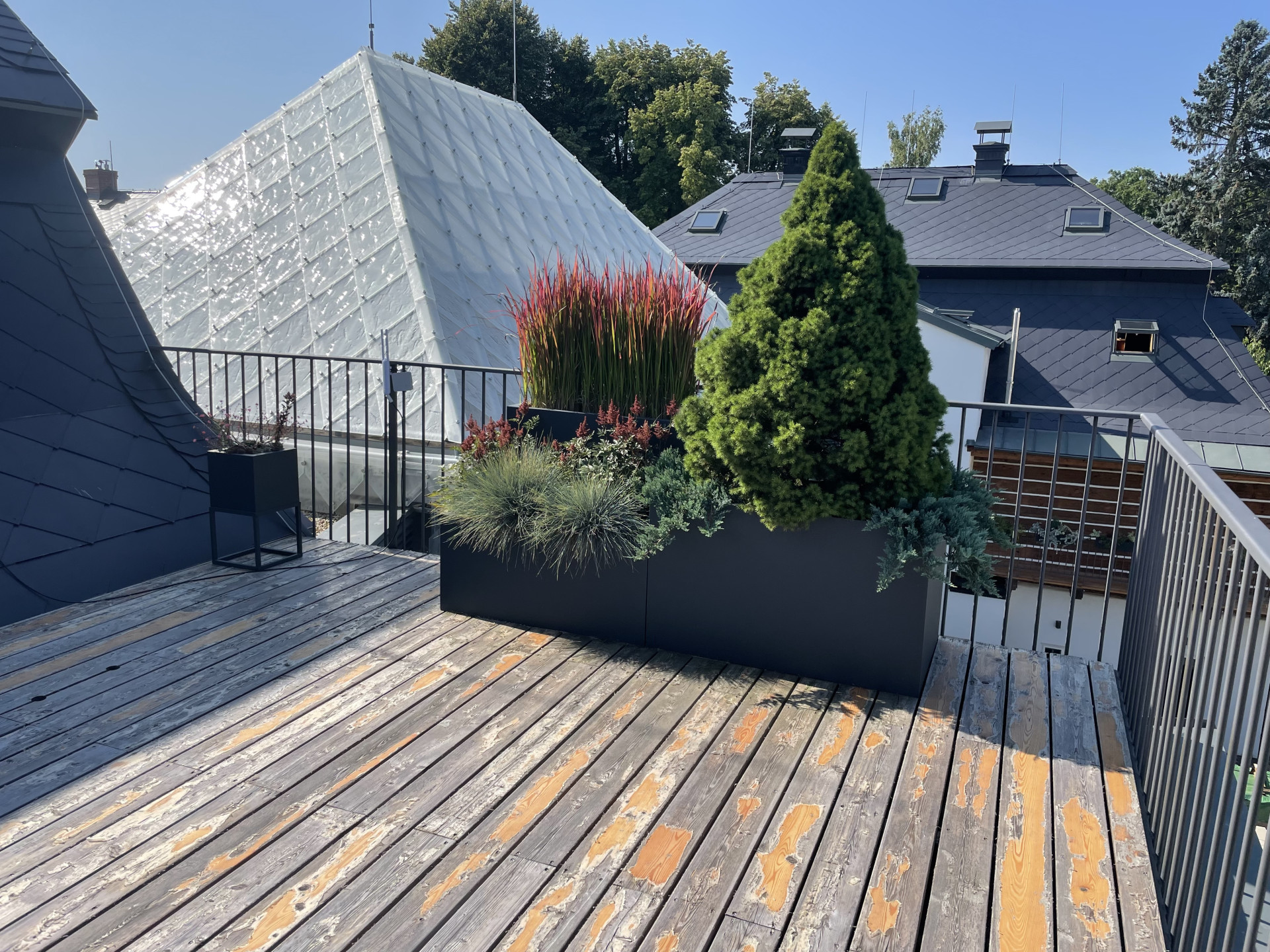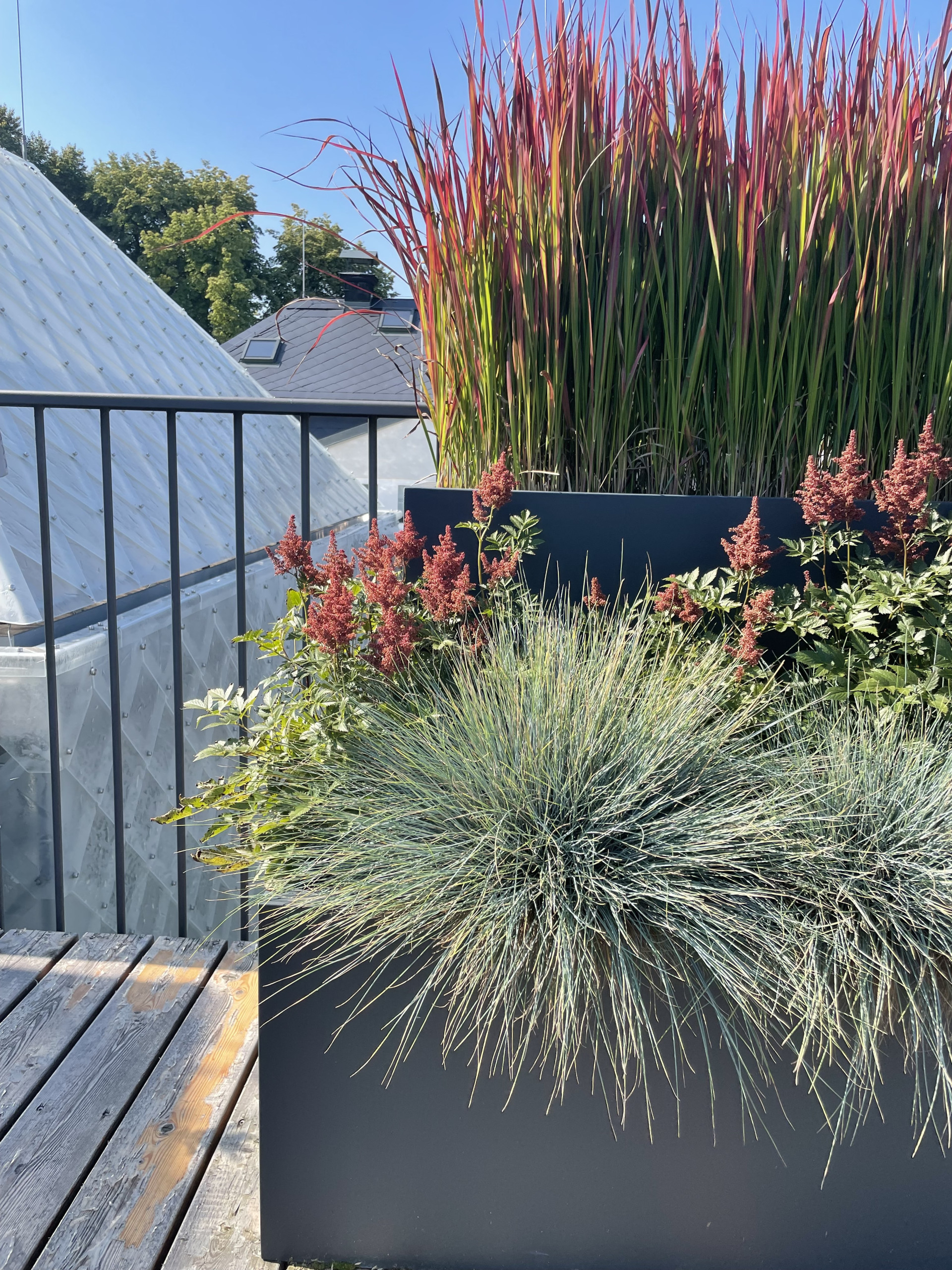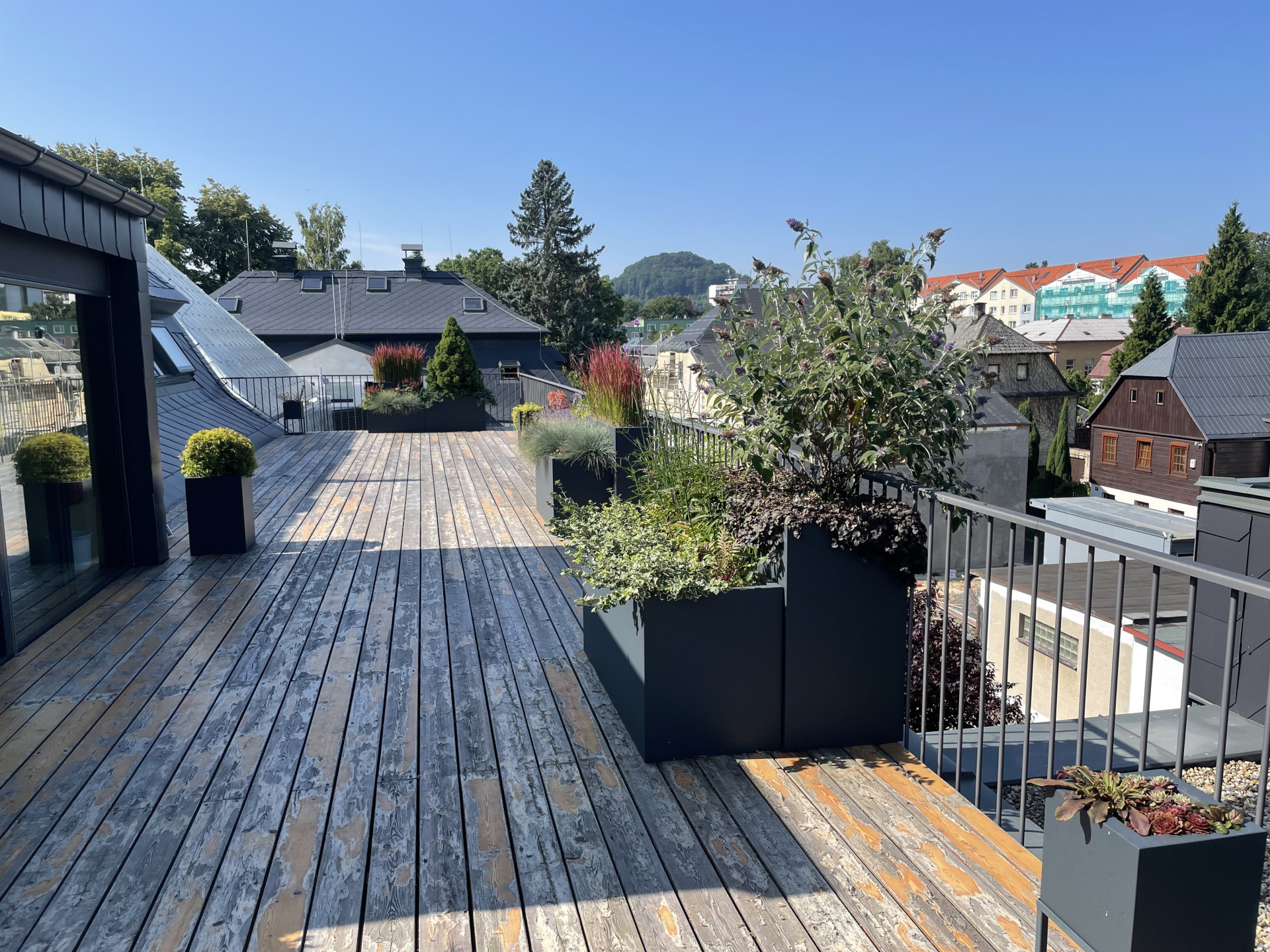 Tvarově jsme se ve venkovní části pohybovali v čistých kvadratických formách. Celkový dojem z květináčů je velice nenápadný a umírněný. O to více vyniká výsadba, kterou tvoří mix barevných trav a jehličnanů. Také umístění květináčů za sebe, místo vedle sebe tvoří zajímavý efekt. Různě vysoké rostliny tak tvoří kaskády a opticky působí bohatším a kompaktnějším dojmem. Počet nádob je zvolen citlivě a celkově působí terasa díky květináčům vzdušně a uvolněně.