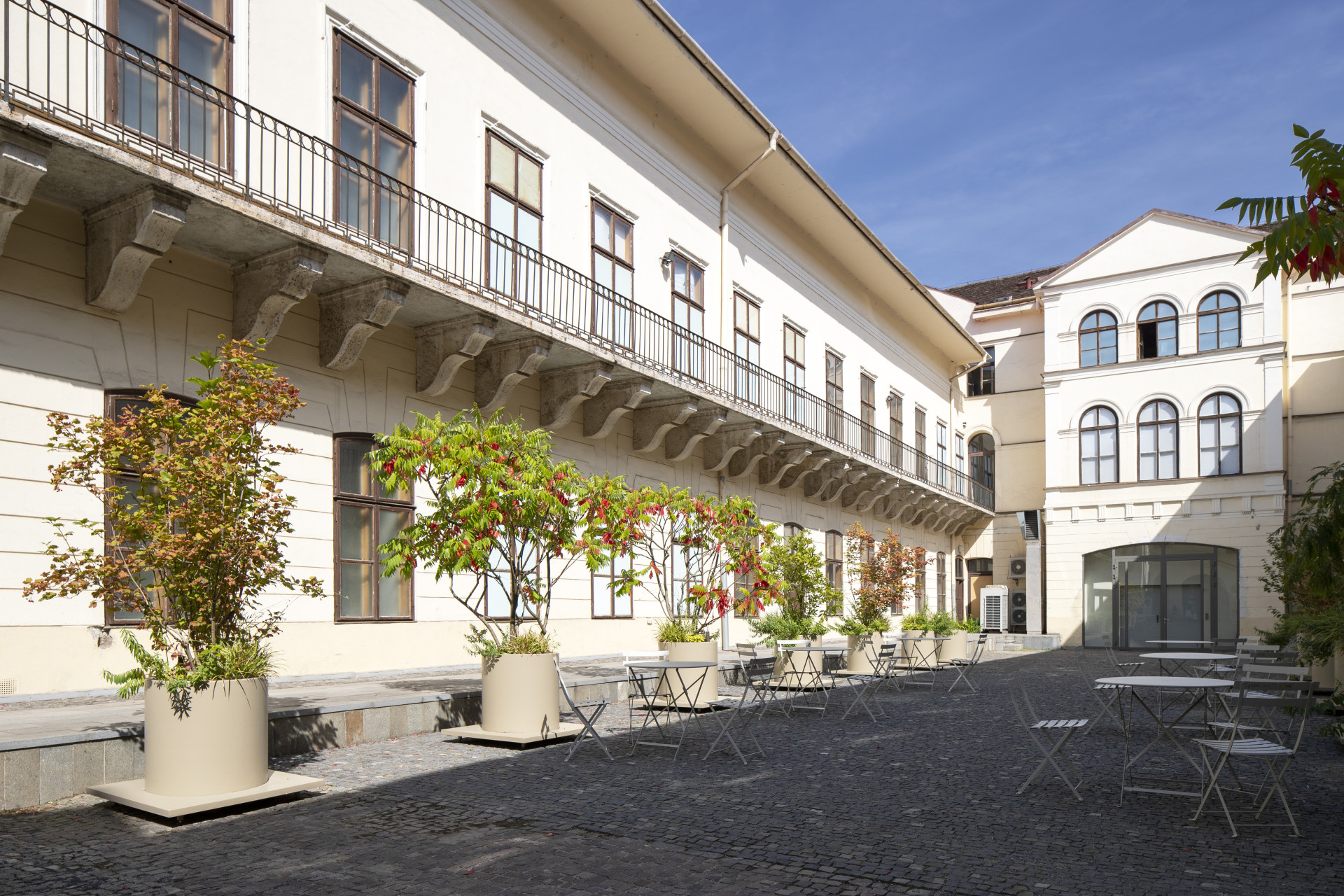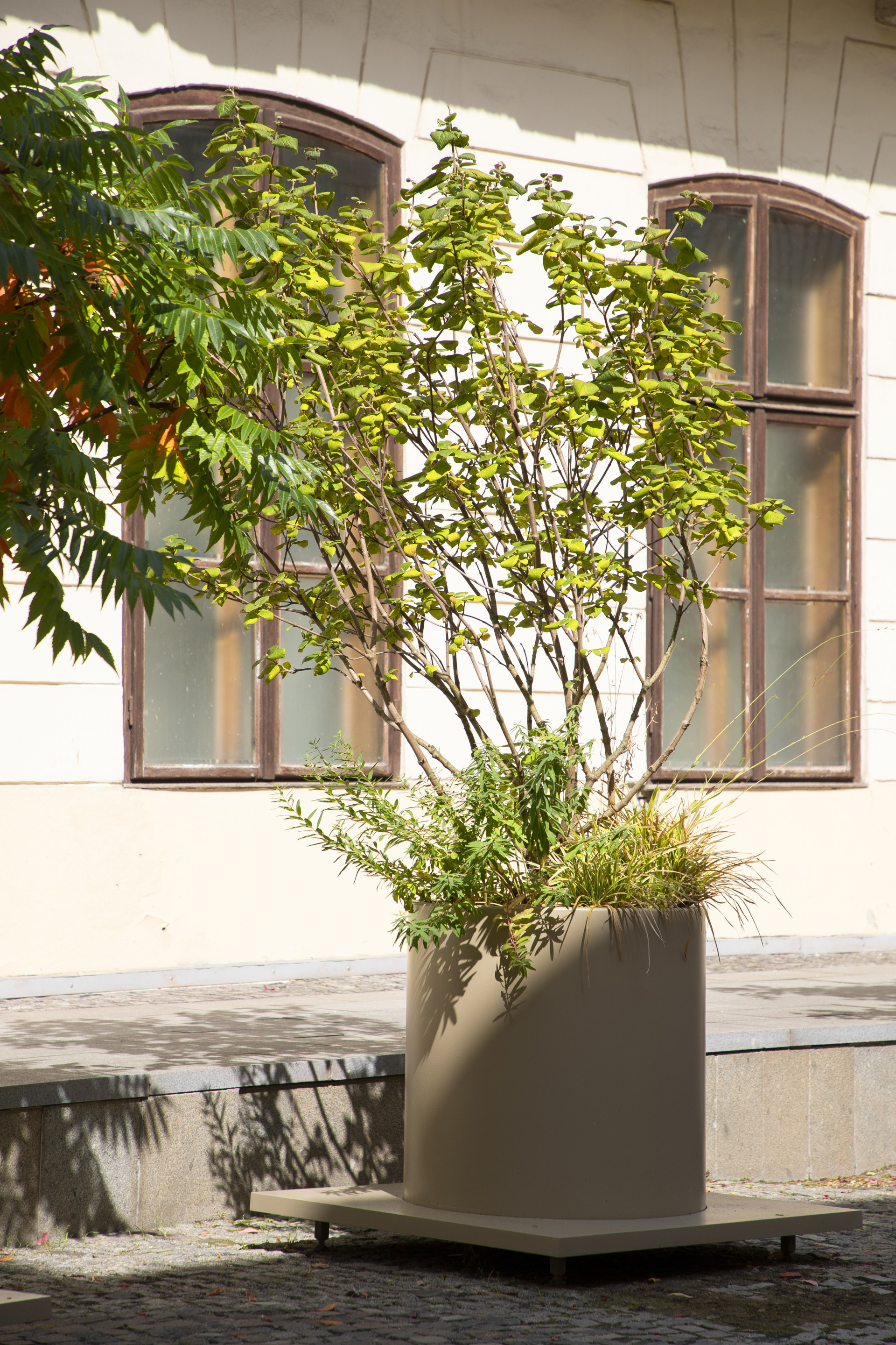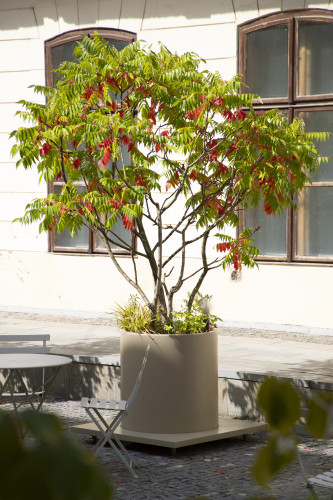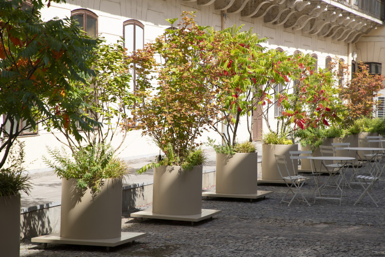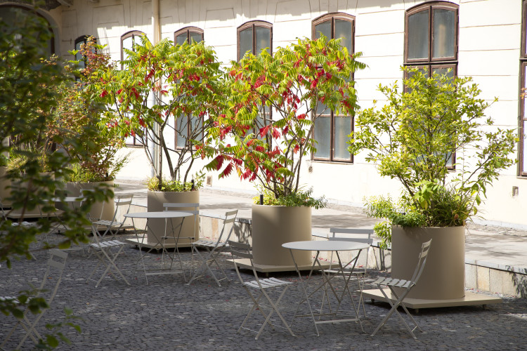 Nádvoří galerie je dnes živým místem, které slouží ke konání různých akcí a workshopů. Požadavek na mobilitu květináčů byl proto podmínkou. U této konkrétní zakázky jsou to výškově nastavitelné nožičky, které umožňují přesun nádob pomocí mechanizace.