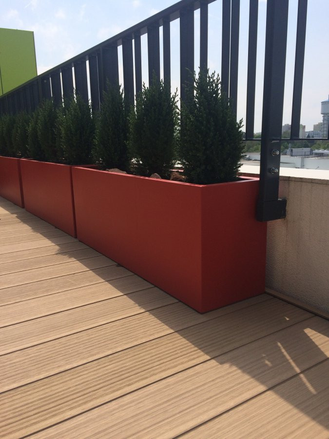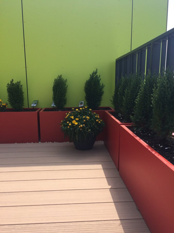 Jednou z prvních vlaštovek je i tato soukromá venkovní terasa, která díky květináčům na terasu v červené barvě doslova ožila. Truhlíky mají různé velikosti, aby se docílilo optického sjednocení tvaru terasy a celé dílo působilo kompaktním dojmem.