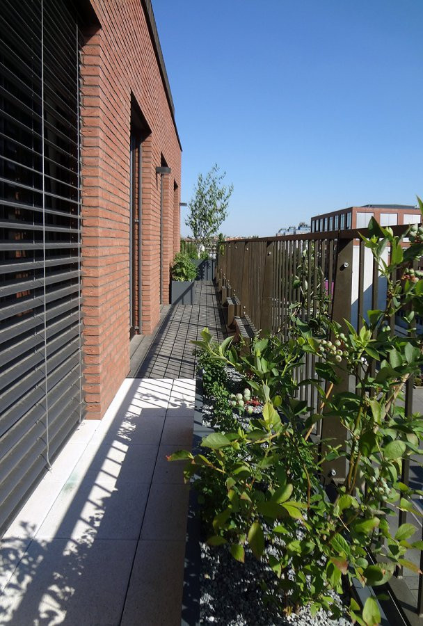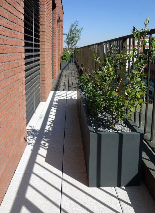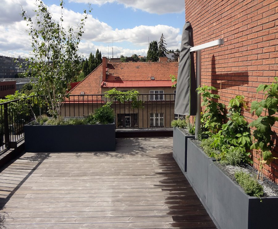 Úprava terasy přiléhající k bytu v pražských Dejvicích využívá velké květináče a truhlíky v elegantní antracitové barvě RAL 7016. Celkem bylo instalováno 10 květináčů různých velikostí, včetně jednoho s úložným prostorem.