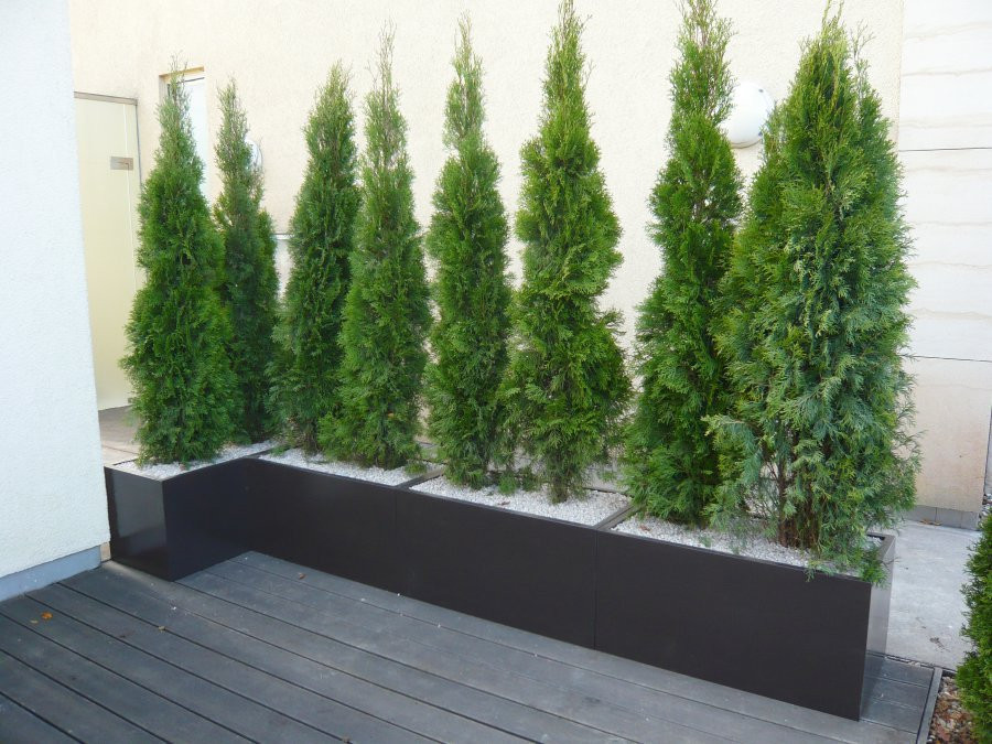 Pro tuto soukromou venkovní terasu jsme navrhli a dodali velké květináče z odolného sklolaminátu, které jsou ideálním řešením pro květináče na terasu.