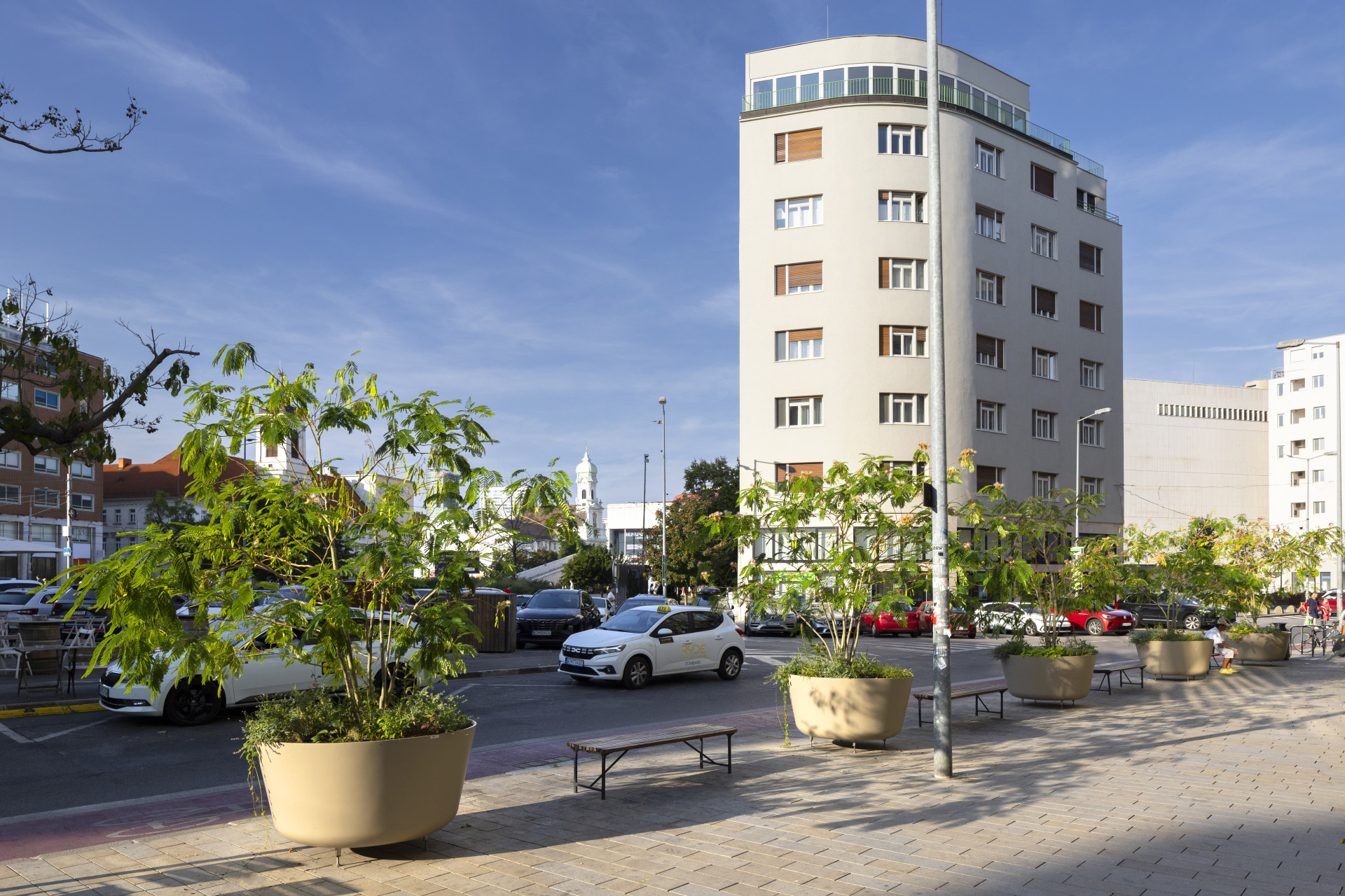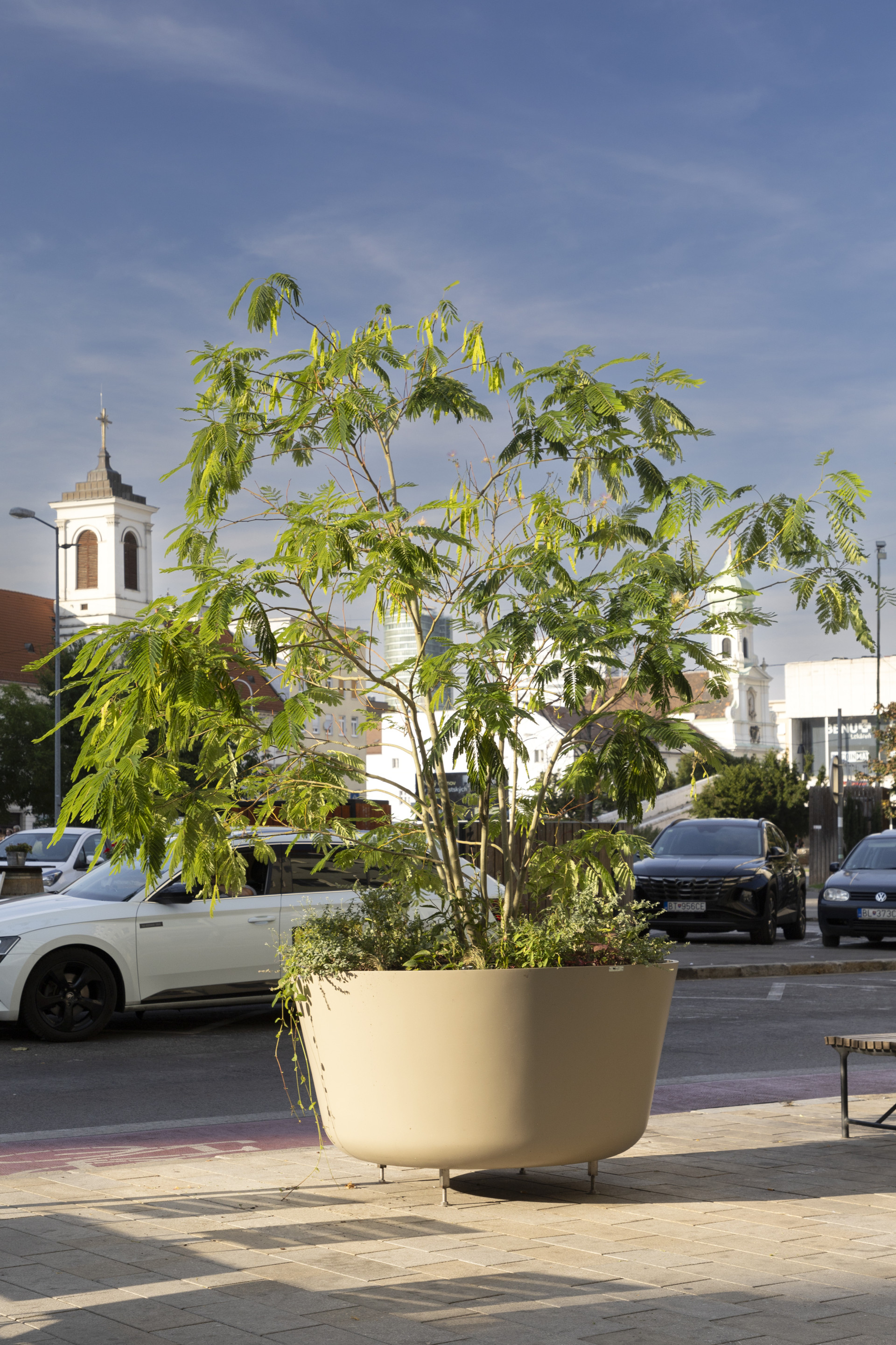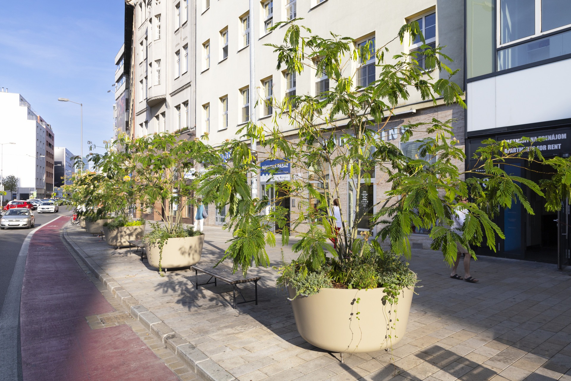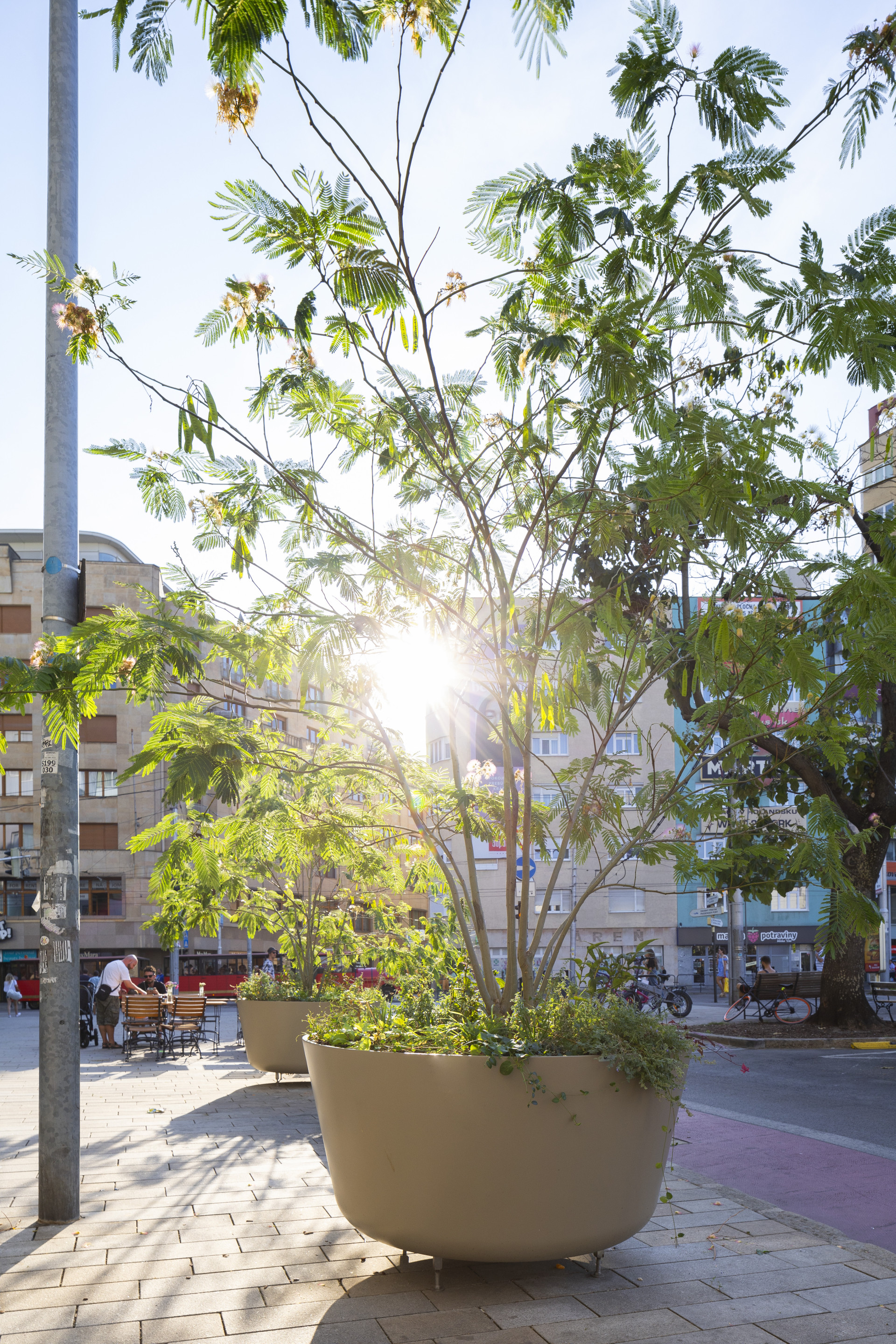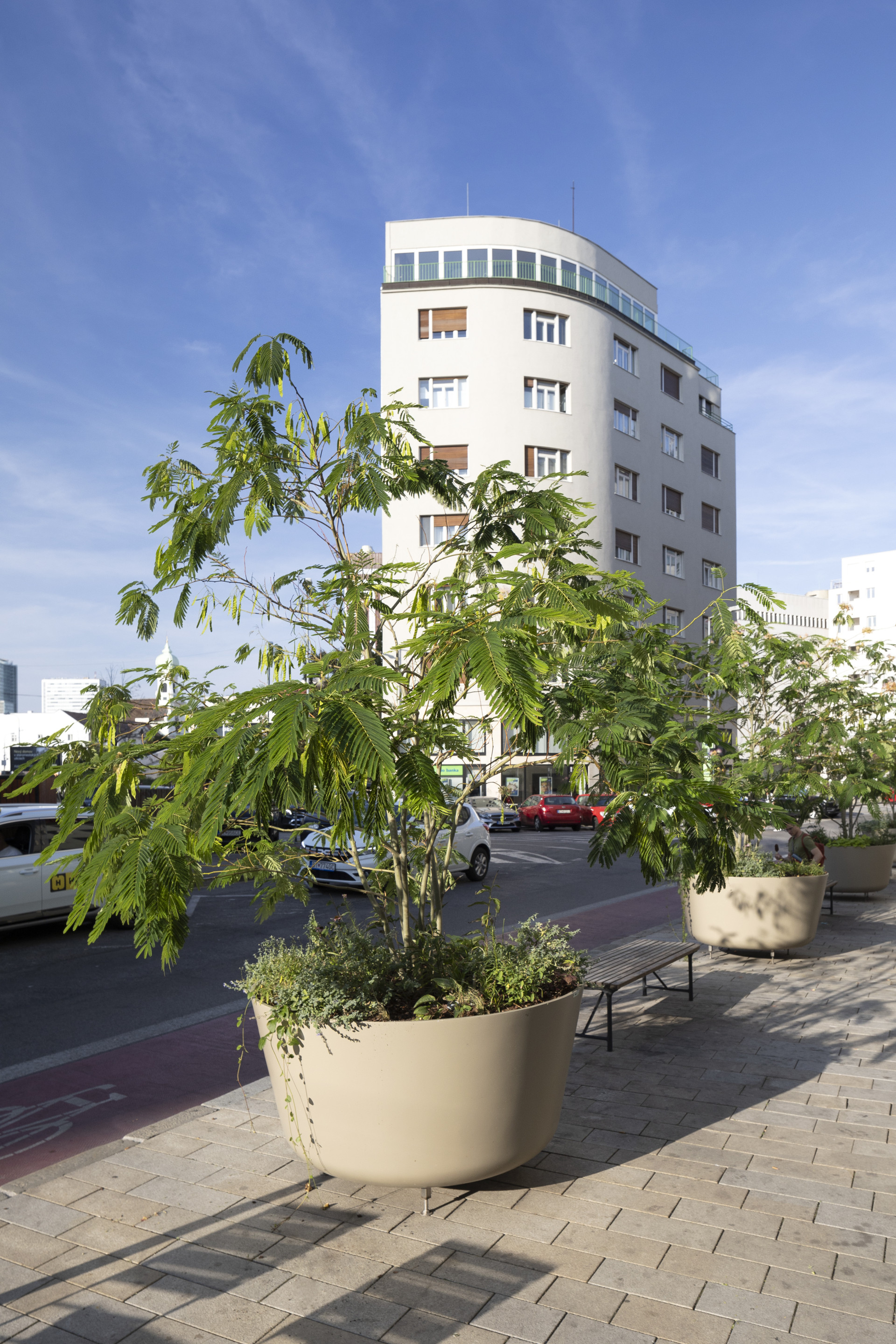 Květináče BASE XXL o průměru 1500 mm a výškou 700 mm zajišťují kvalitní kořenový bal pro růst rostlin. Výškově nastavitelné nožičky jsou kvalitním příslušenstvím, které vyrovná nedokonalosti povrchu a květináče se stávají stabilními a mobilními. Mobilita květináčů je nejčastějším požadavkem ve veřejném prostoru měst a obcí. Realizace v Bratislavě dokazuje, že na velikosti květináčů záleží, stávají se dominantními a estetickými prvky, právě díky zvolené velikosti. Velmi vkusně byl vybrán i jemný odstín nádob RAL 1019 korespondující s fasádou okolních budov. Velké květináče ze sklolaminátu jsou skvělou volbou pro designový, trvanlivý městský mobilář pro města a obce.