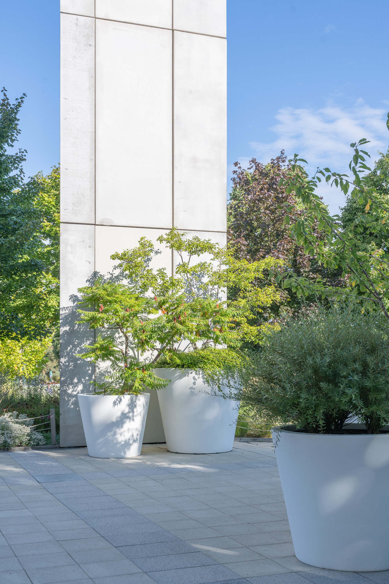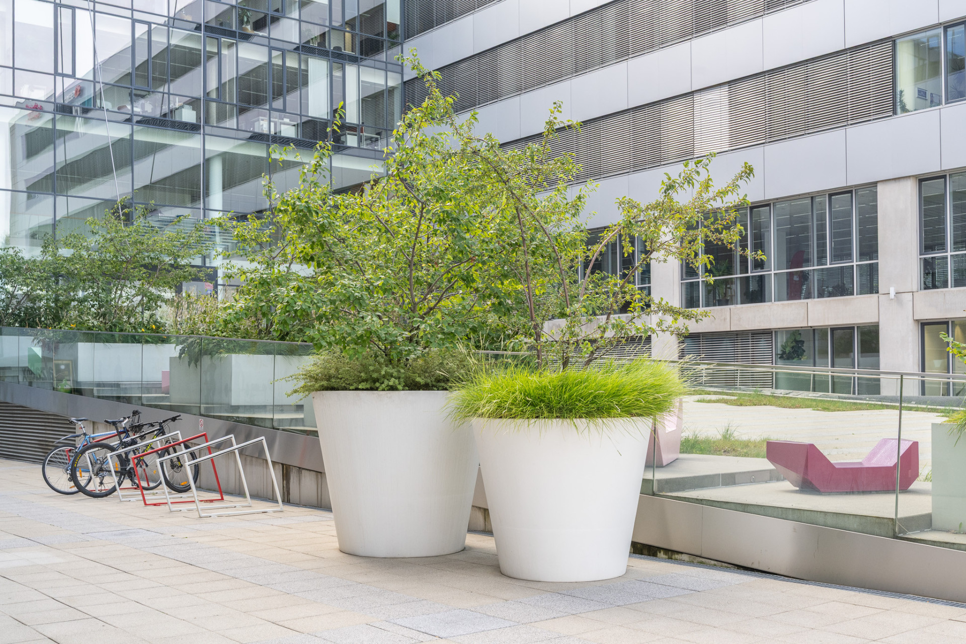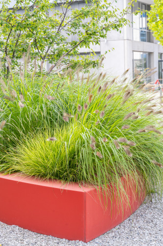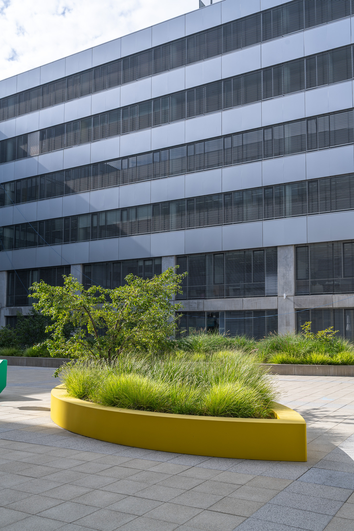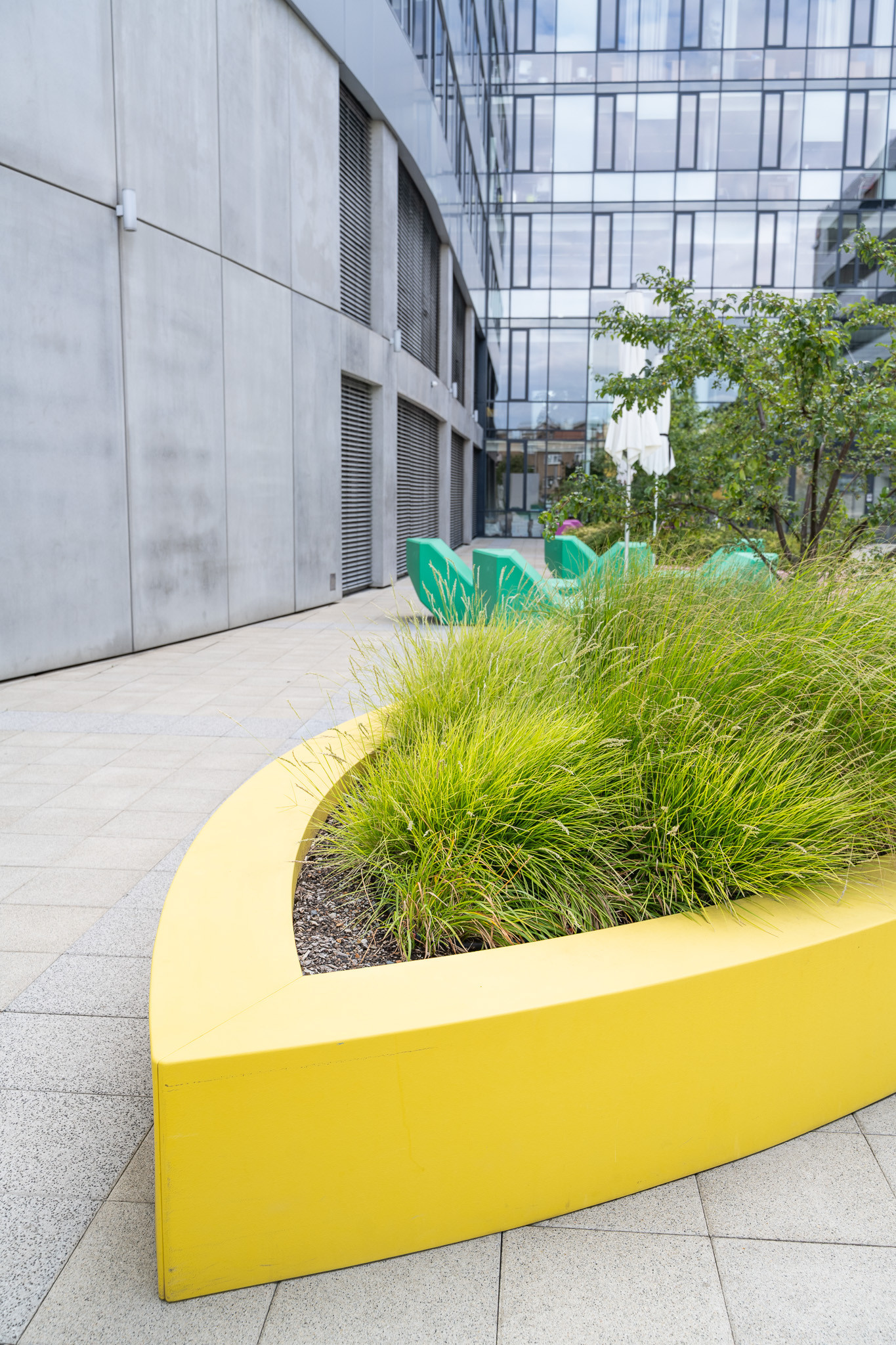 Veřejné místo na rozsáhlých betonových plochách doplňují velké a odolné květináče Calippo, kde se dobře ujaly stromy a keře. Plochu rozjasnily barevné modely květináčů beze dna osázené vysokými travami, které přidaly měkkost a sezónní proměnlivost. Na realizaci je zároveň vidět, jak důležitou roli hraje kvalitní údržba — je znát práce zahradníků a pravidelnost péče, díky které výsadba drží tvar i kondici.