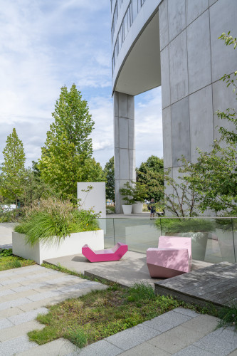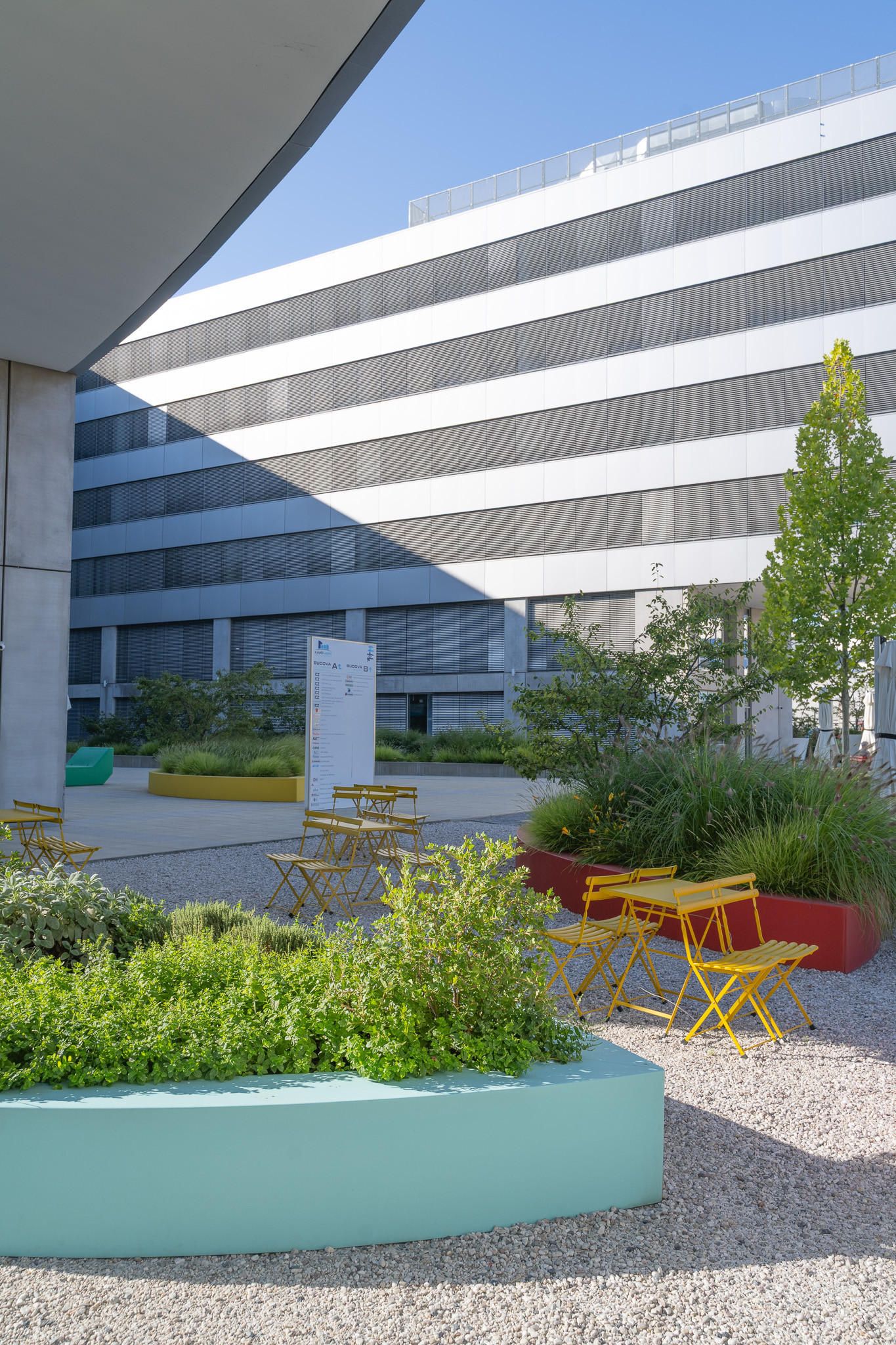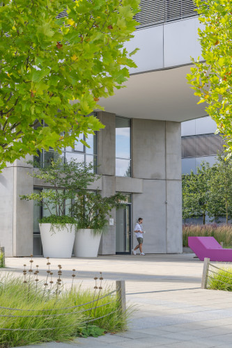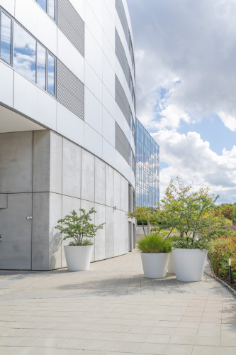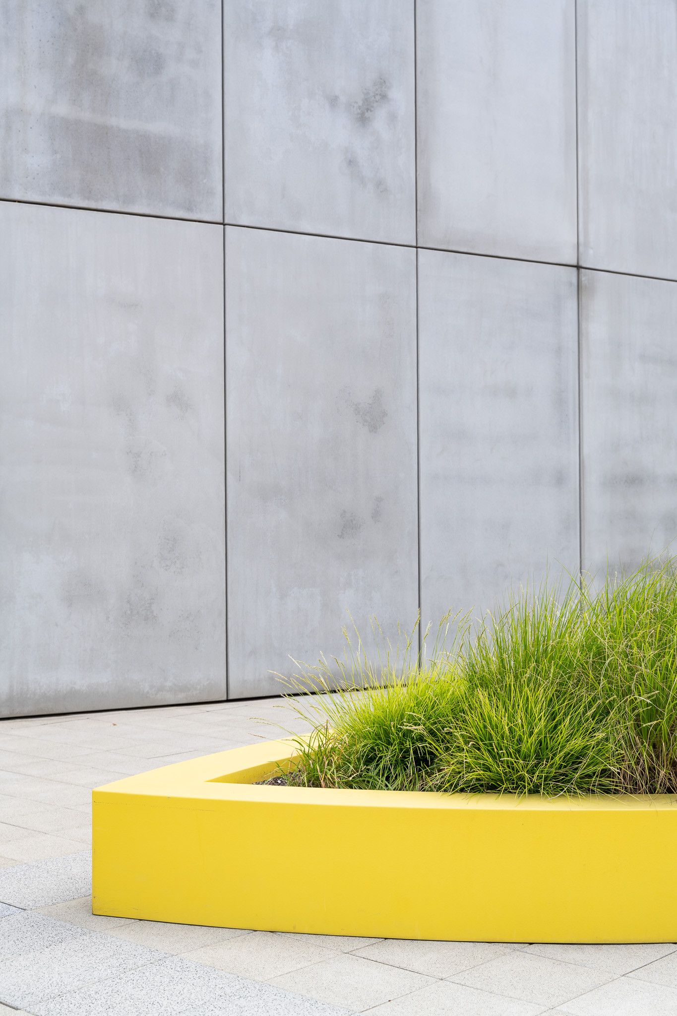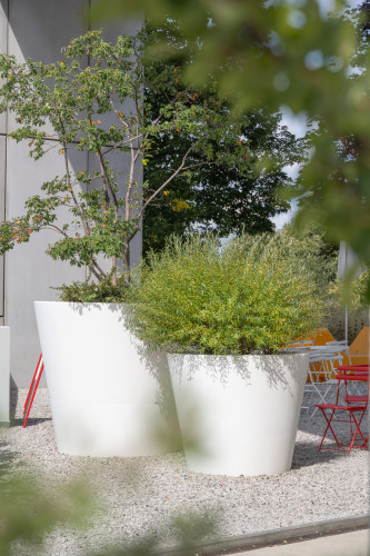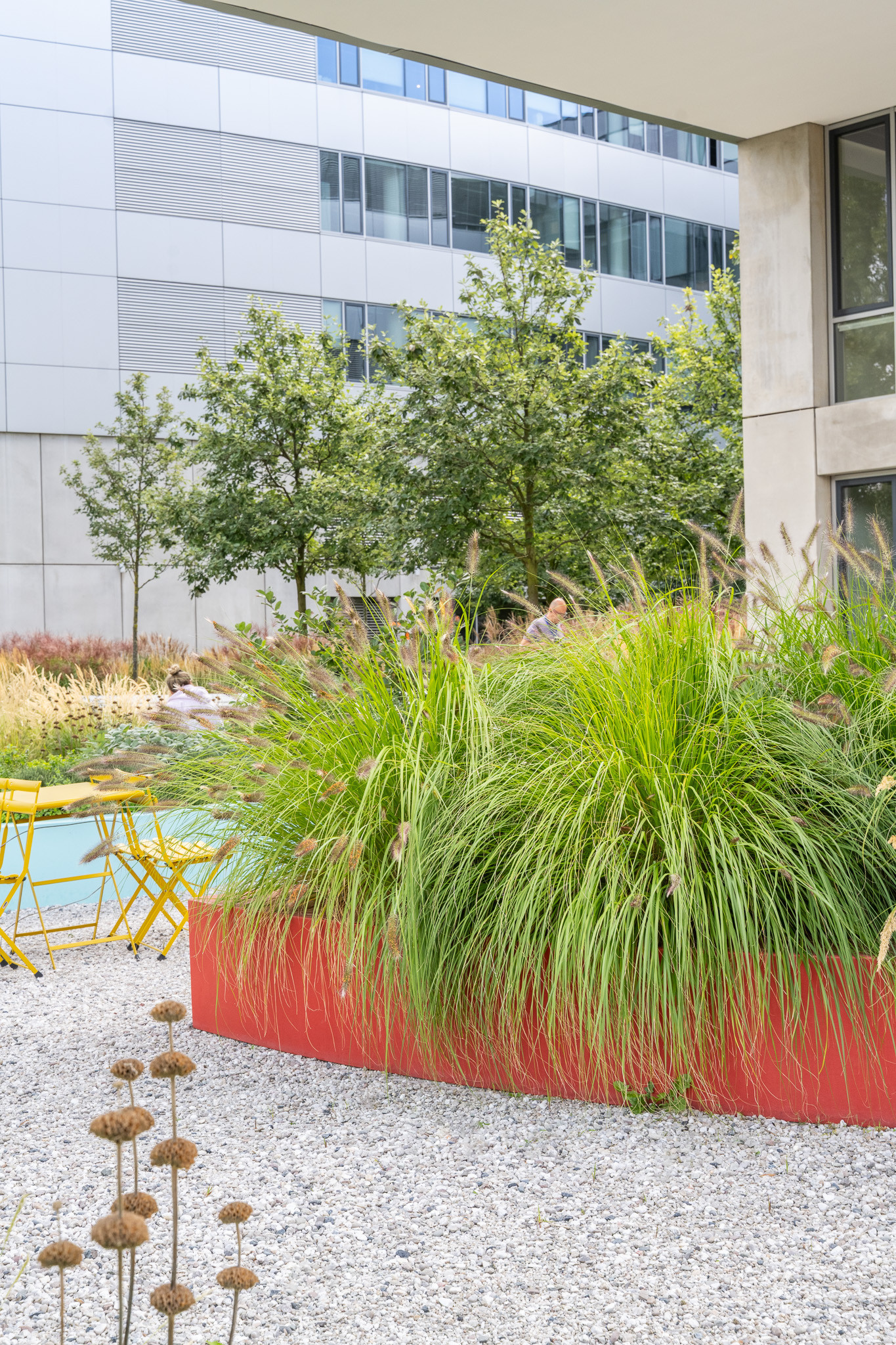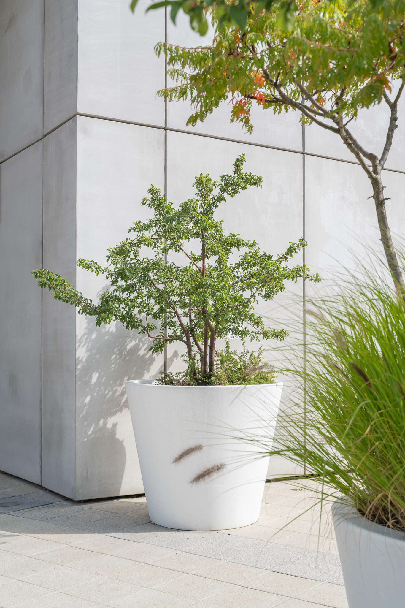 Veřejné místo na rozsáhlých betonových plochách doplňují velké a odolné květináče Calippo, kde se dobře ujaly stromy a keře. Plochu rozjasnily barevné modely květináčů beze dna osázené vysokými travami, které přidaly měkkost a sezónní proměnlivost. Na realizaci je zároveň vidět, jak důležitou roli hraje kvalitní údržba — je znát práce zahradníků a pravidelnost péče, díky které výsadba drží tvar i kondici.