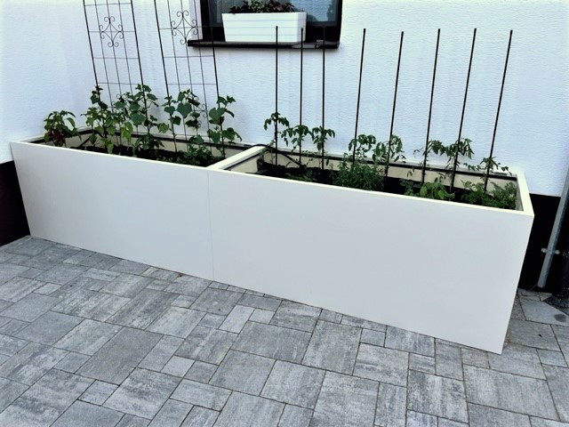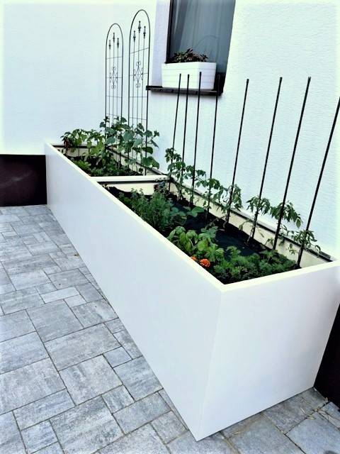 V případě teras a balkonů se využívají k pěstování velké truhlíky, které slouží jako vyvýšené záhony. Svou velikostí jsou tyto truhlíky dostačující k pěstování různých druhů zeleniny, drobného ovoce a bylin. Nejinak tomu je také v případě naší zákaznice, která ve velkoobjemových truhlících na zakázku pěstuje rajčata na své dlážděné terase. Sklolaminátové truhlíky na zakázku splňují všechny předpoklady pro úspěšné pěstování. Jsou odolné, stálé a jejich velikost si můžete vybrat podle Vašich přání a možností stejně jako barevný odstín.