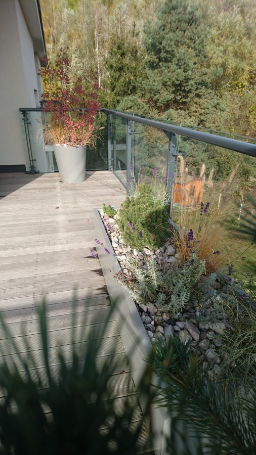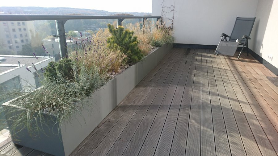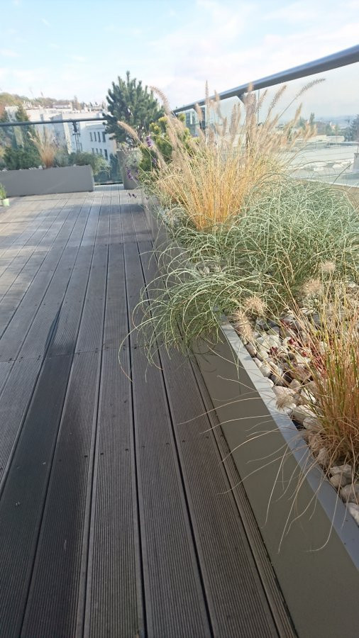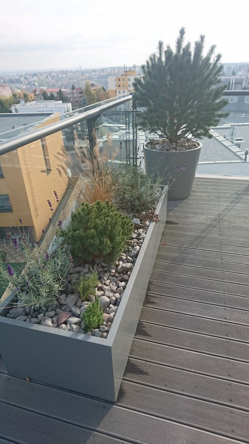 Majitelé se rozhodli na terase vytvořit pocit soukromí a dopřát si výhled do zeleně. Toho se jim podařilo docílit pomocí velkoobjemových truhlíků umístěných do řady podél hrany terasy. Strohost a fádnost truhlíků velmi jednoduše majitelé rozbili kulatými, kónickými květináči, které umístili do rohů terasy. Velmi krásně a pečlivě osazené květináče zelenými rostlinami, travinami, ale i menšími jehličnany vytváří na terase velmi příjemné posezení. Myslíme si, že záměr majitelů se podařilo beze zbytku naplnit.